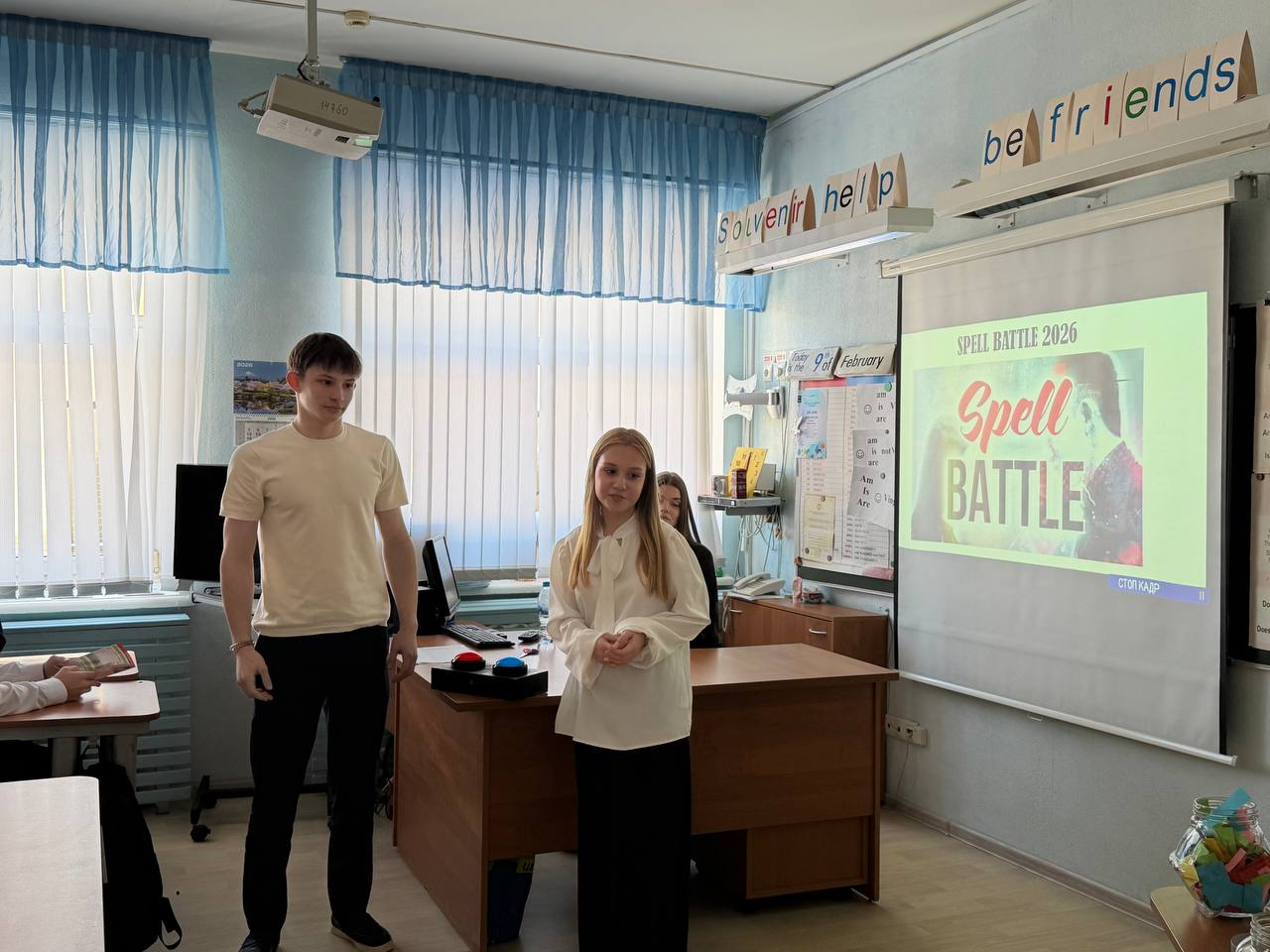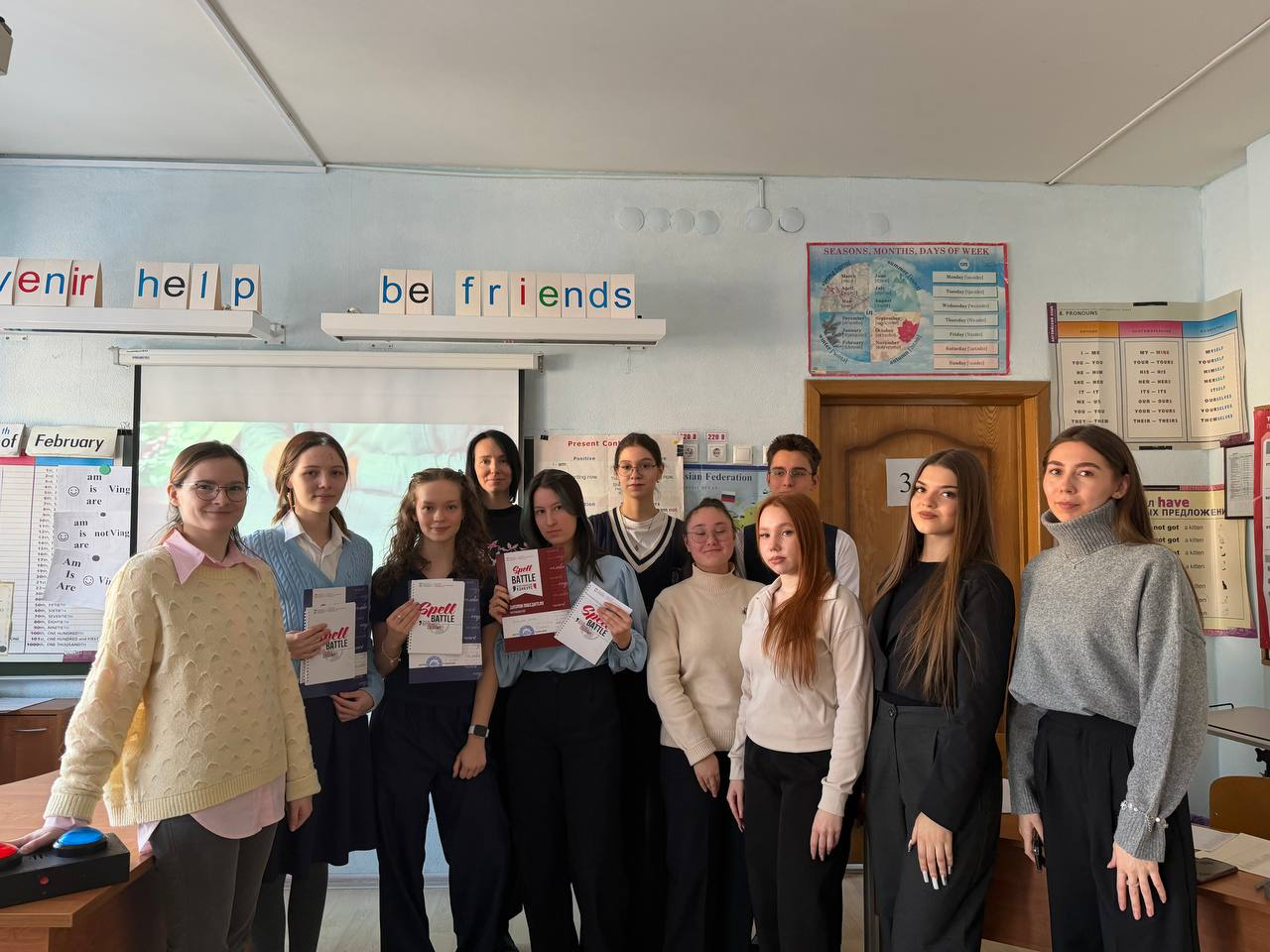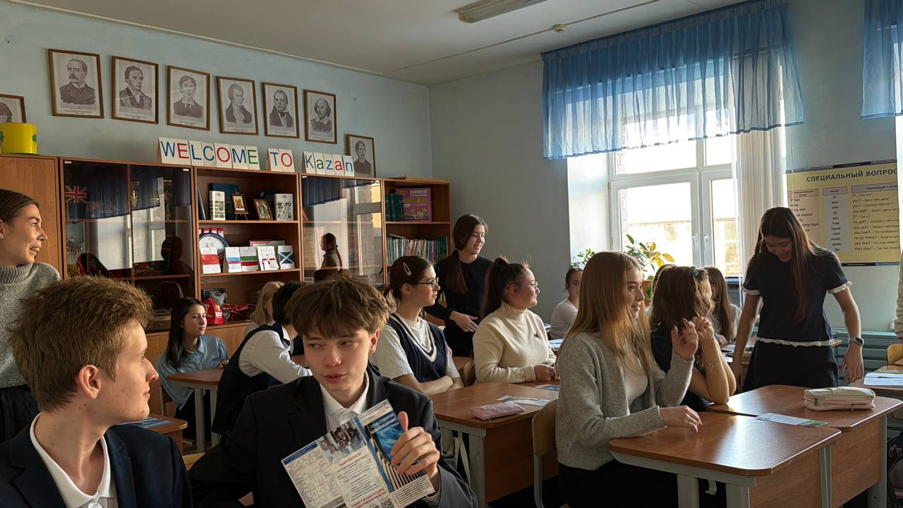 Серия игр проекта «Spell Battle – 2026» стартовала в МБОУ «Лицей № 177» г. Казани, куда команда организаторов была приглашена в рамках недели английского языка учителем Хасанзяновой Зульфией Саидовной, выпускницей КФУ ИФМК. 9 февраля прошли три увлекательные игры, проведенные ст.преподавателем кафедры контрастивной лингвистики Шейниной Диной Петровной, зам. заведующего Центра сопровождения социально-воспитательной деятельности Ягудиной Региной Рустямовной и студентами 1 курса ИФМК Сабитовой Полиной, Сибиревой Дарьей, Федоровой Анной. На этот раз в игре, где нужно продемонстрировать не только знание лексики на русском и английском языках, но и скорость реакции, участвовали ученики трёх десятых классов (10А,10Б,10В). Ребятам к их вниманию были предложены буклеты с информацией об институте, показан видеоролик с экскурсией по ИФМК.