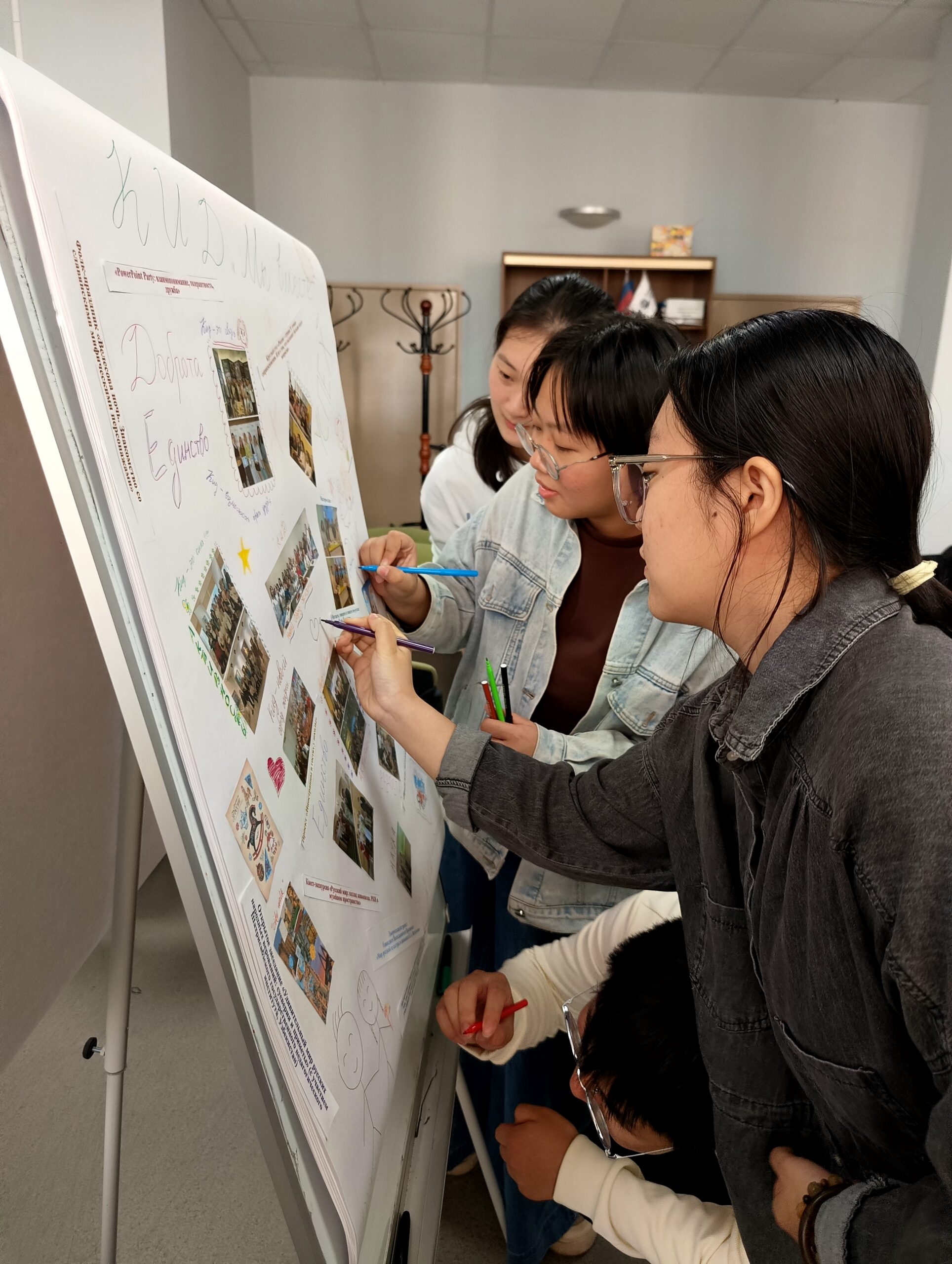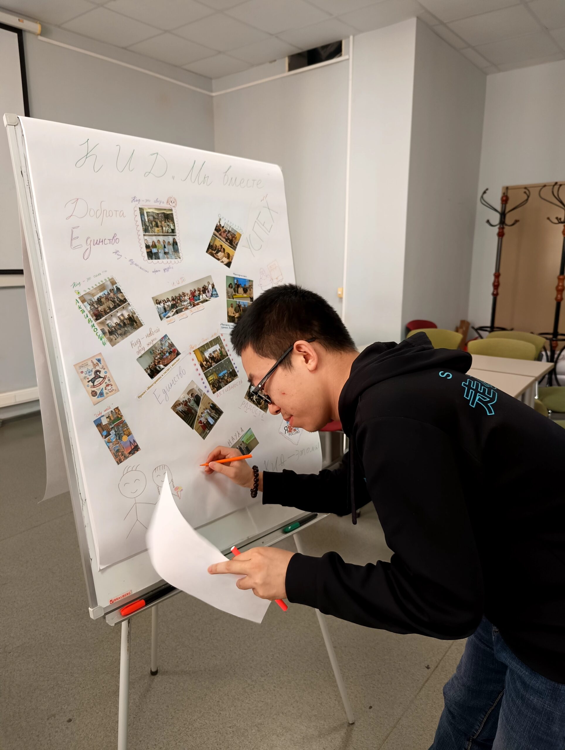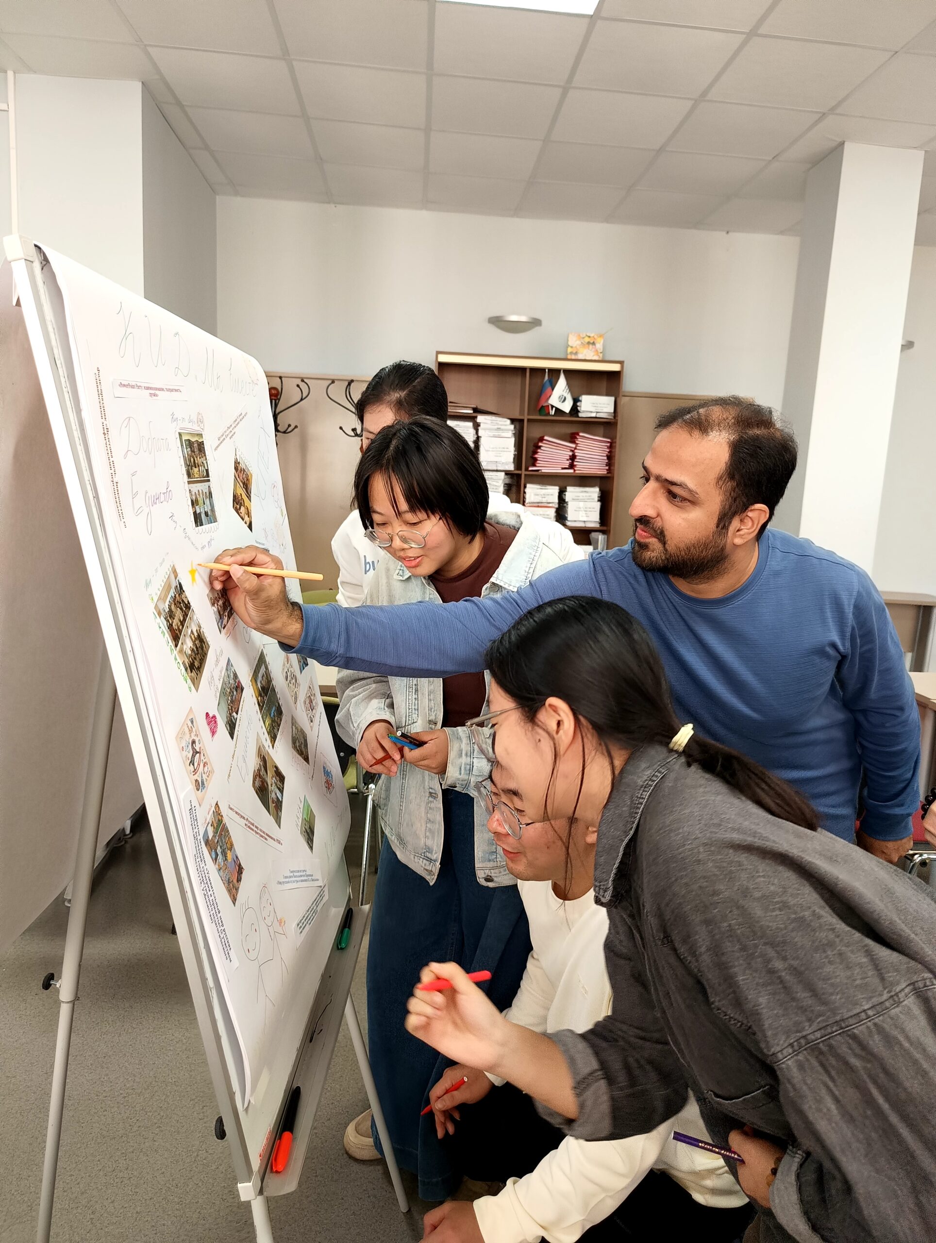 Мероприятие началось с командного задания: участники дружно взялись за создание настенной газеты, посвященной КИДу. Фломастеры, карандаши, вырезки – каждый штрих и каждая надпись отражали общий энтузиазм и личное видение роли Клуба в студенческой жизни. Этот творческий процесс, органично сочетавший элементы тимбилдинга, стимулировал свободный обмен идеями и способствовал исчезновению языковых барьеров в процессе достижения общей цели. Кто-то рисовал, кто-то писал яркие слоганы, кто-то мастерил коллажи – и в результате появилась газета, ставшая своеобразным отчётом о проектах и событиях КИДа. Фотографии, запечатлевшие яркие моменты встреч, экскурсий, мастер-классов, праздников, а также слова, которые студенты ассоциируют с Клубом – «дружба», «единство», «согласие», «доброта», «успех», «активность», «радость» и др. – сделали газету живой и трогательной.