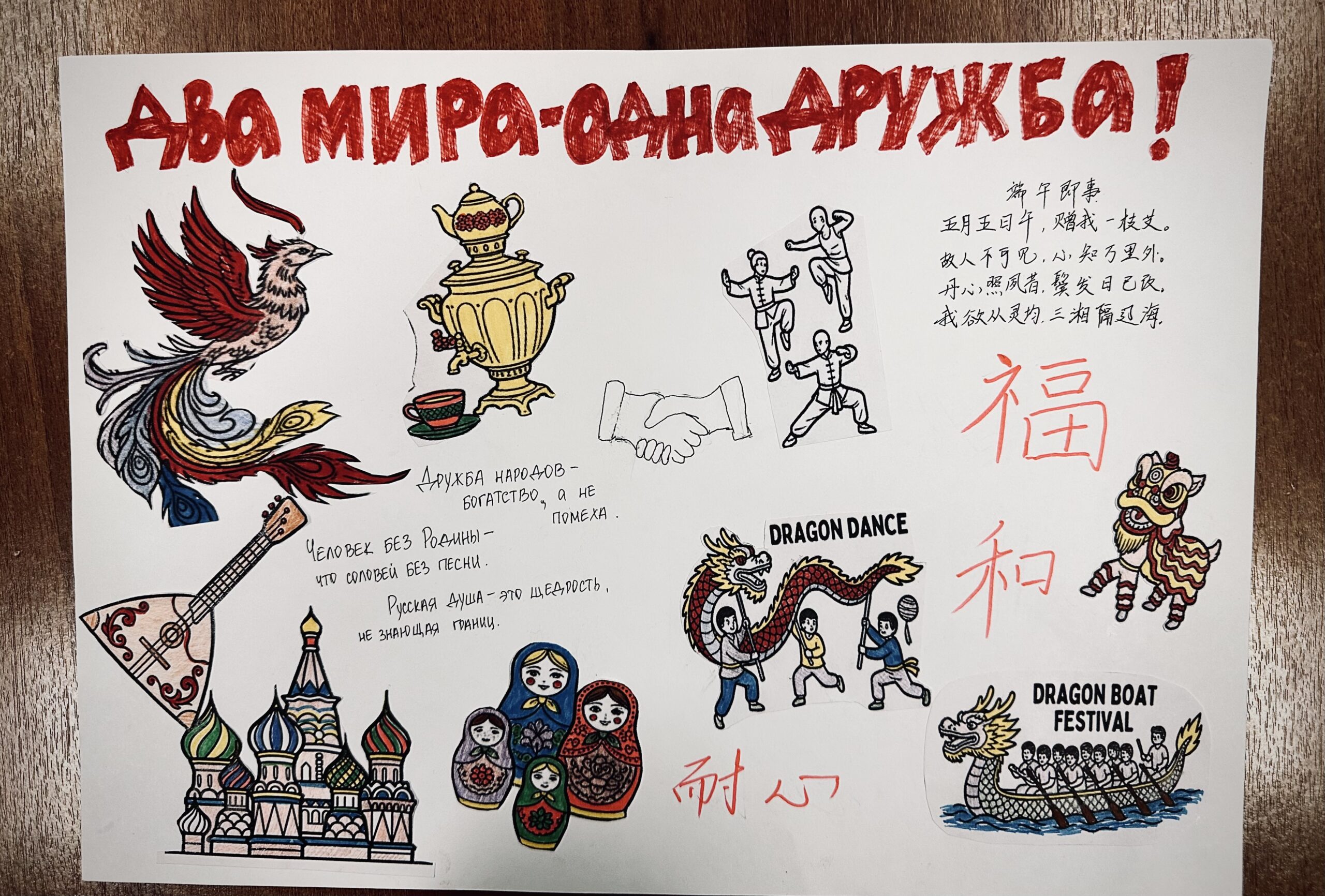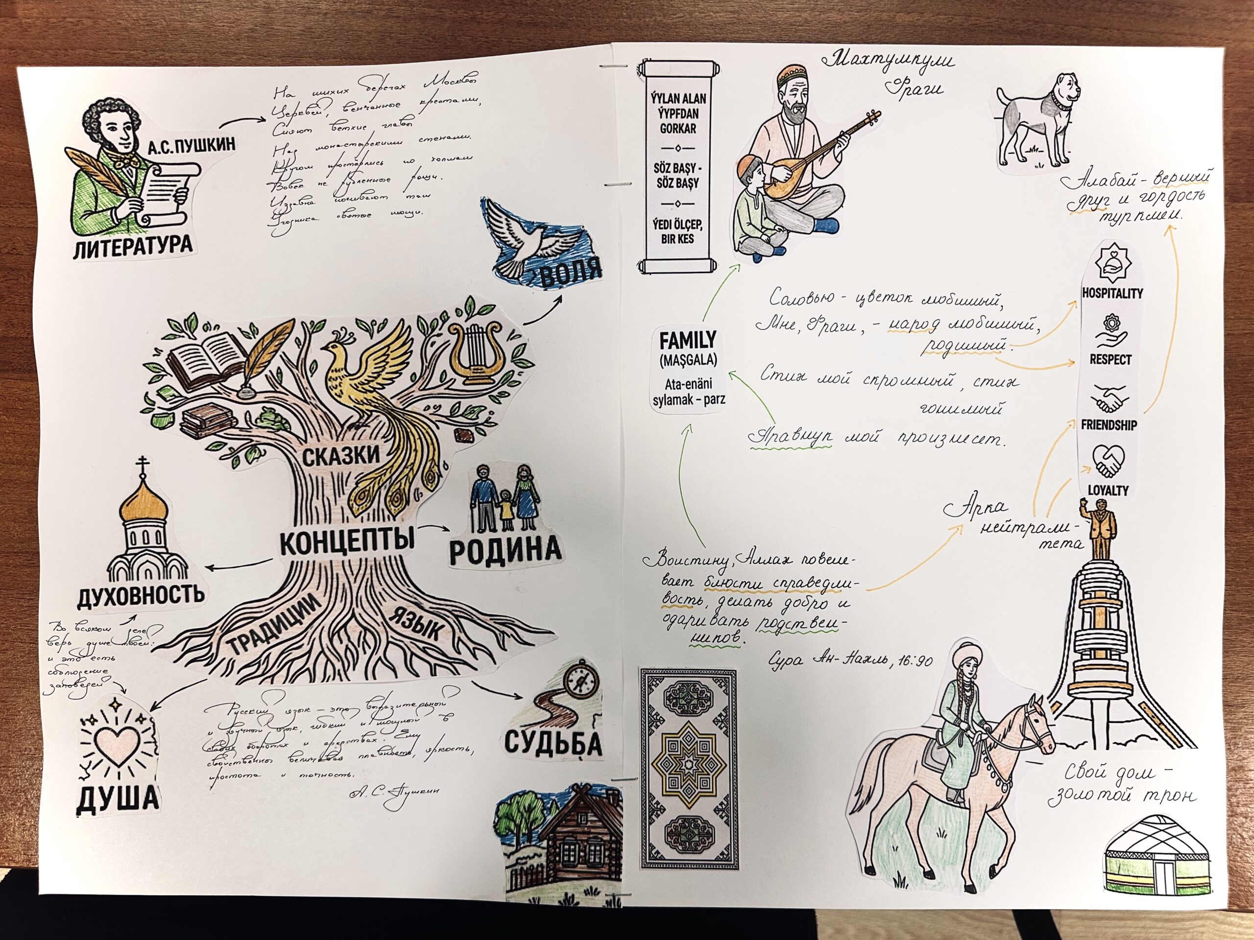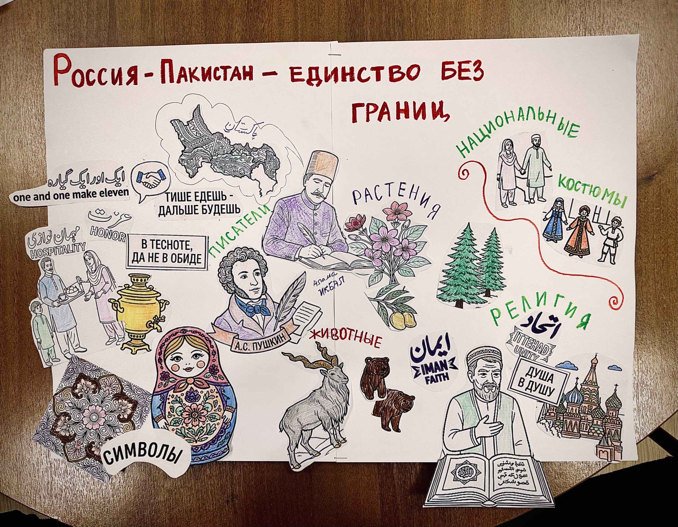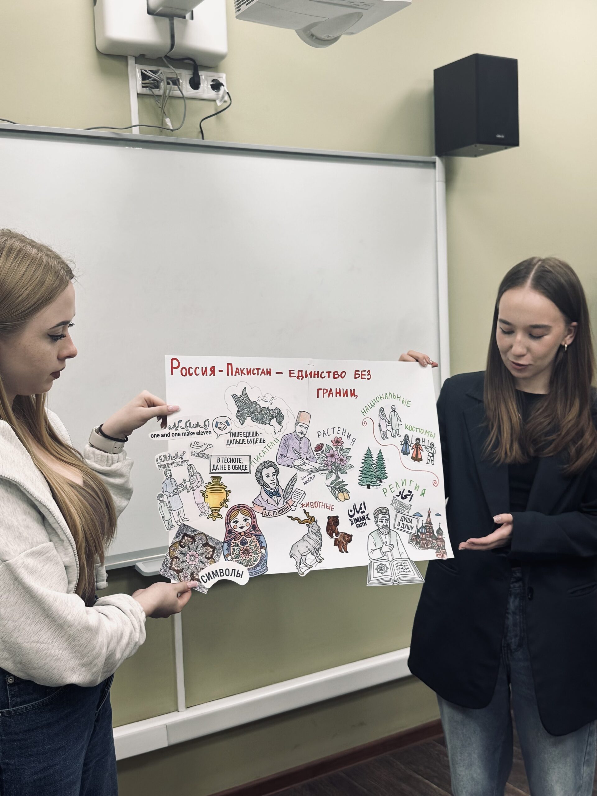 В результате кропотливой работы и мозгового штурма китайская иероглифика сплелась с русскими орнаментами, туркменские ковровые узоры заговорили с русскими берёзками на языке метафор, а пакистанская мудрость и гостеприимство откликнулись на русскую щедрость и соборность. Ребята сравнивали прецедентные имена, символы веры и быта, находя удивительные параллели там, где, казалось бы, лежат культурные пропасти.