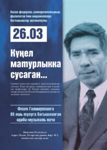 Әдәбият галиме һәм тәнкыйтче, филология фәннәре докторы, Казан федераль университетның атказанган профессоры, Җ. Вәләди премиясе лауреаты, Татарстанның һәм Россия Федерациянең атказанган мәдәният эшлеклесе Фоат Галимуллинга 85 яшь тулуга багышланган әдәби-музыкаль кичә «Күңел матурлыкка сусаган...» - 26 март, башлана 14 сәгатьтә, адрес: Казан, Татарстан урамы, йорт № 2, өченче кат, актлар залы.