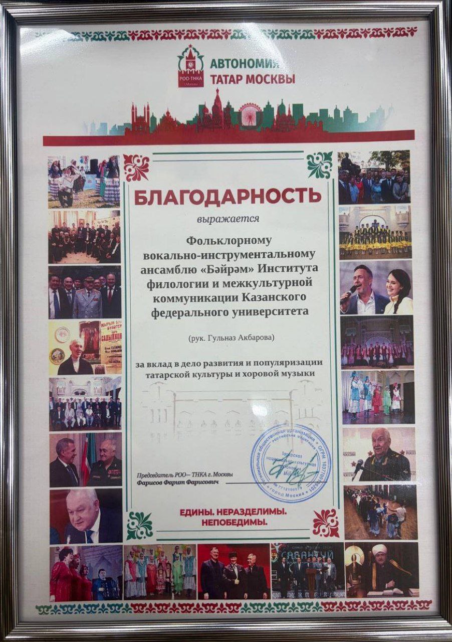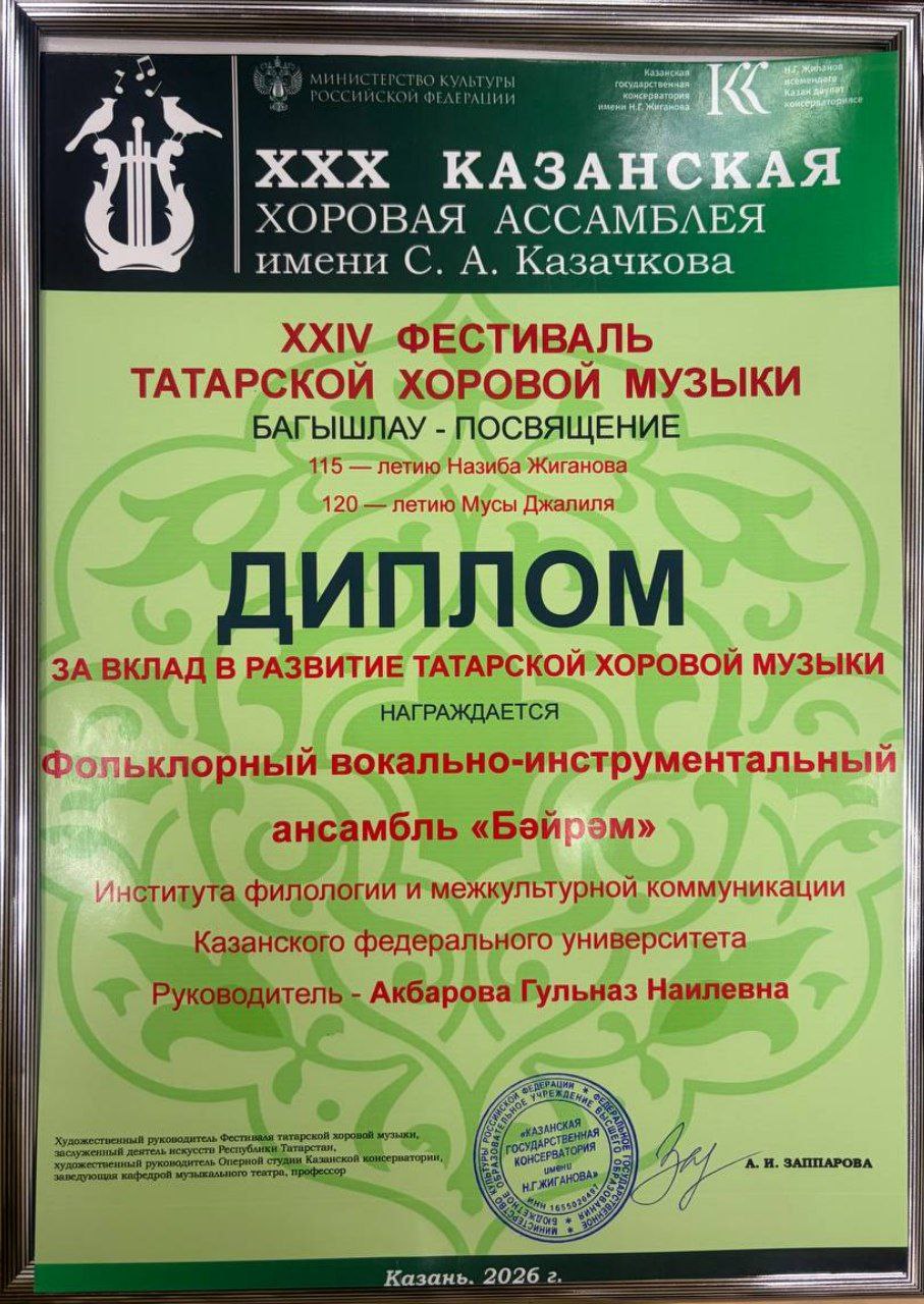 Выступление ансамбля «Бәйрәм» стало одним из лучших номеров концерта. Коллектив был отмечен благодарственным письмом за вклад в дело развития и популяризации татарской культуры и хоровой музыки, а также дипломом участника Фестиваля татарской хоровой музыки в рамках XXX Казанской хоровой ассамблеи имени С.А. Казачкова.