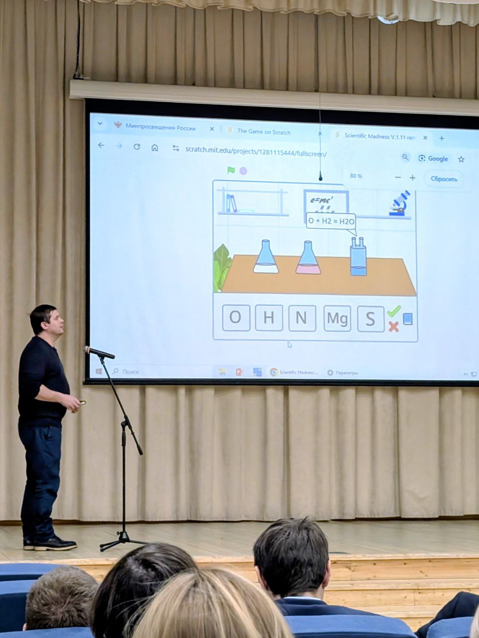 Во второй части встречи Андрей Владимирович и Тимур Рафикович провели практический мастер-класс по использованию языка программирования Scratch для создания мини-компьютерных игр. Школьники смогли увидеть, как буквально за короткое время можно разработать собственный интерактивный проект.