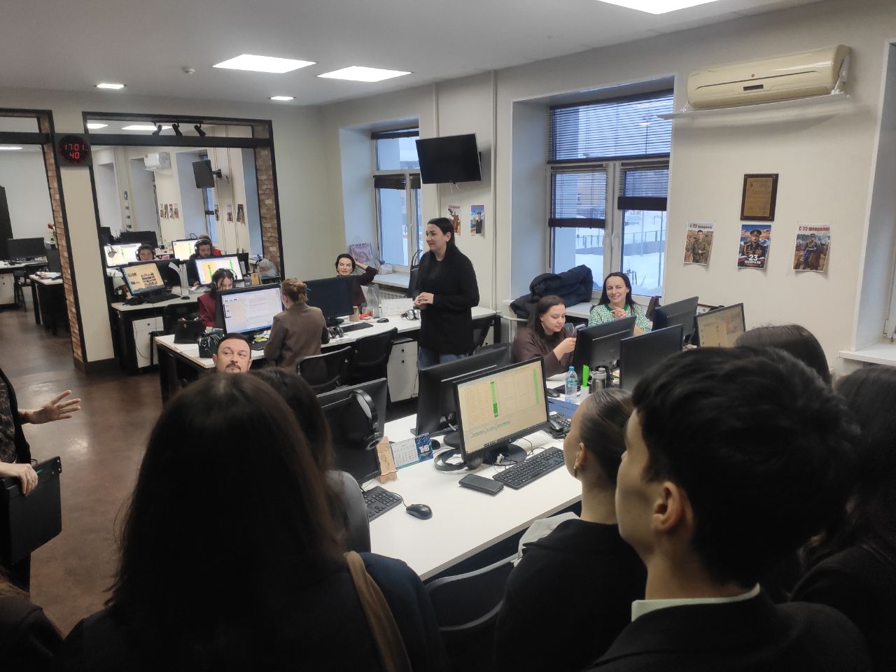 Филология һәм мәдәниятара багланышлар институтының “Гамәли филология: татар теле һәм әдәбияты, җурналистика” юнәлешендә белем алучы 10.2-401 төркем студентлары “Яңа Гасыр” телерадиокомпаниясендә экскурсиядә булып кайтты. Биредә алар әлеге оешманың күпкырлы эшчәнлеге, төбәк телевидениесе тарихы һәм телевидение хезмәткәрләренең эш урыннары белән таныштылар. Булачак журналистлар тапшырулар әзерләнә торган монтаж бүлмәләрен, тавыш яздыру студиясен, яңалыклар чыгару павильонын карадылар. Телетапшырулар әзерләү барышын сәхнә арты күзлегеннән күрү тележурналистларның эш процессын күзаллау өчен бик яхшы мөмкинлек булды. Эшләре тыгыз булуга карамастан, журналистлар кунакларны җылы каршылап, үз һөнәрләренең нечкәлекләре, уңай һәм тискәре яклары турында сөйләп алдылар, студентларның сорауларына да бик теләп җавап бирделәр. Очрашу бик рәхәт һәм ихлас атмосферада узды. Шушы матур хатирәләрне мәңгеләштереп, заманча җиһазландырылган тапшырулар төшерү студиясендә фотоларга төшү – иң кызыклы мизгелләрнең берсе булды.