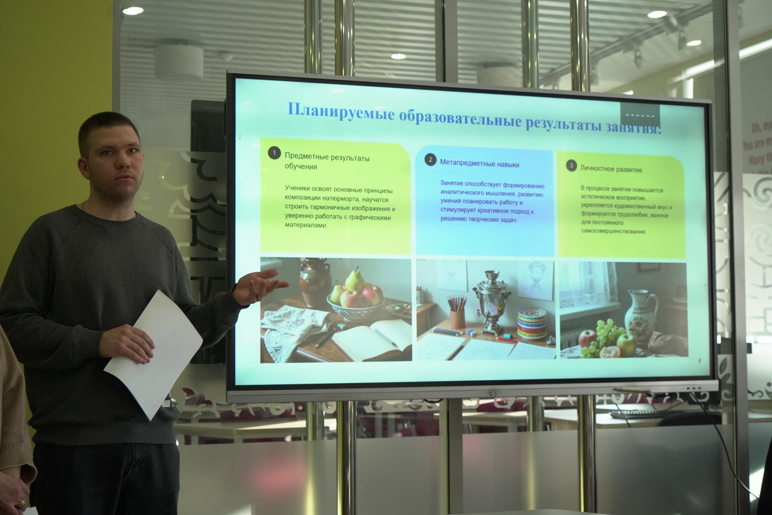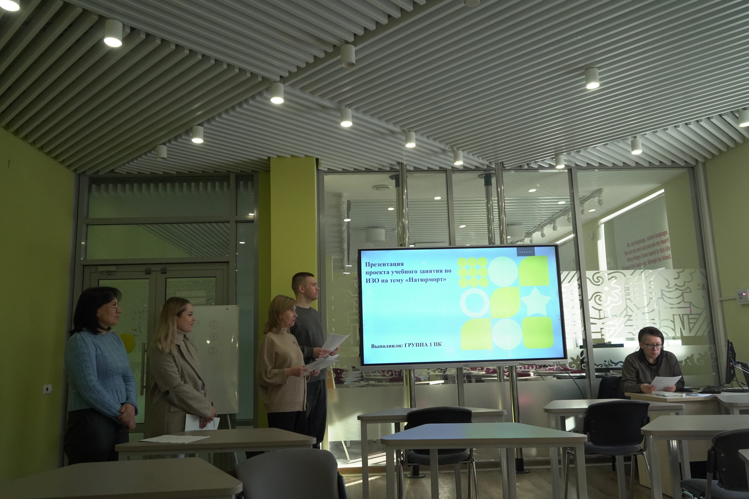Проектная группа 1 (Агафонов К.Э., Белицкая В.К., Гайнуллина З.С., Петрова Н.Ю., Тихонова Е.А.) представила разработку занятия для учащихся 4 класса на тему «Натюрморт», основаную на сочетании инновационных и классических методов обучения и достижении образовательных результатов, имеющих практическую целесообразность.