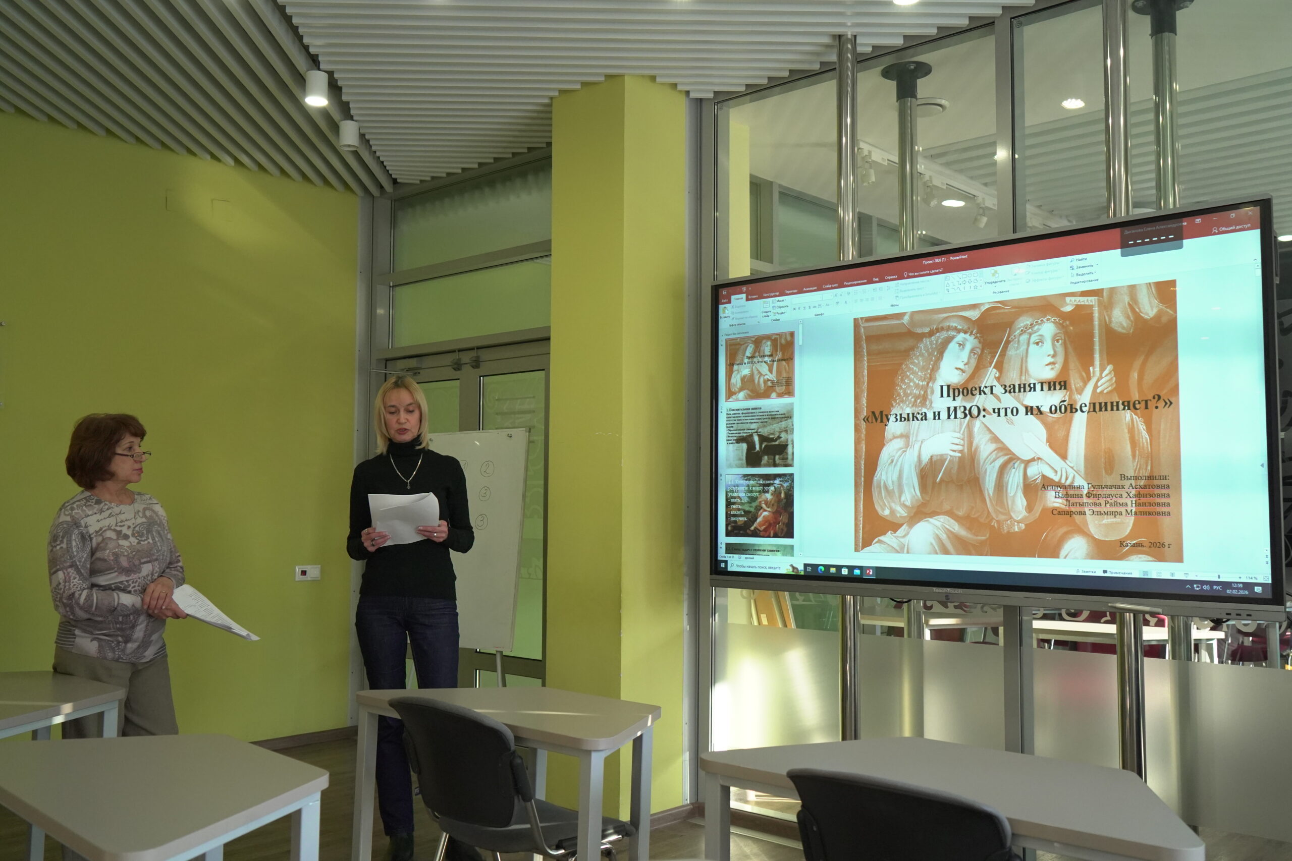 Проектная группа 2 (Аглиуллина Г.А., Вафина Ф.Х., Сапарова Э.М.) предложила разработку интегрированного урока для учащихся 5 класса на тему «Музыка и ИЗО: что их объединяет», направленного на развитие синестетического восприятия, поиск общих паттернов и выразительных средств в разных видах искусства.