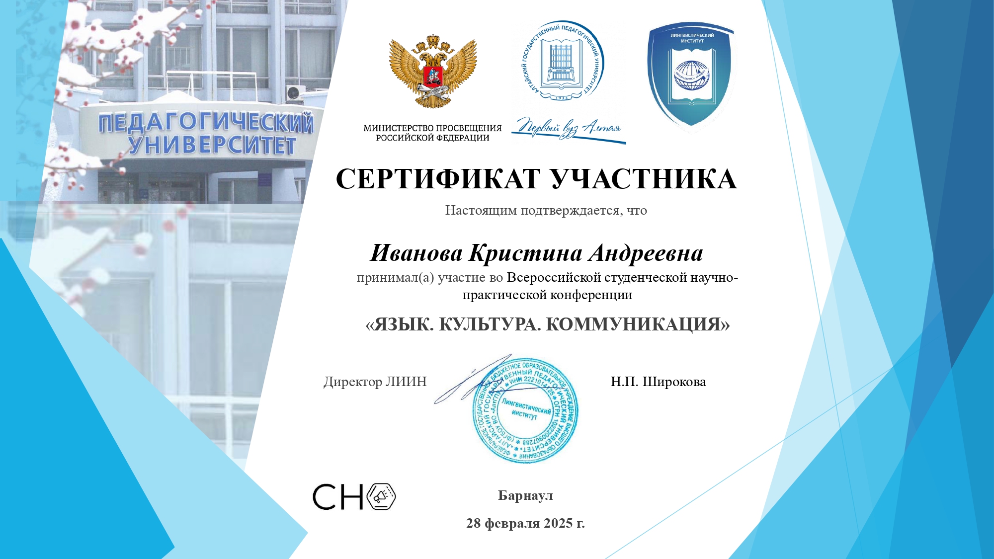 В феврале 2025 года Иванова К.А. приняла участие во Всероссийской студенческой научно-практической конференции «Язык. Культура. Коммуникация», организованной Литературным институтом Алтайского государственного педагогического университета (г. Барнаул). Данное мероприятие позволило ей войти в научно-дискуссионное поле, сфокусированное на базовых категориях филологического знания.