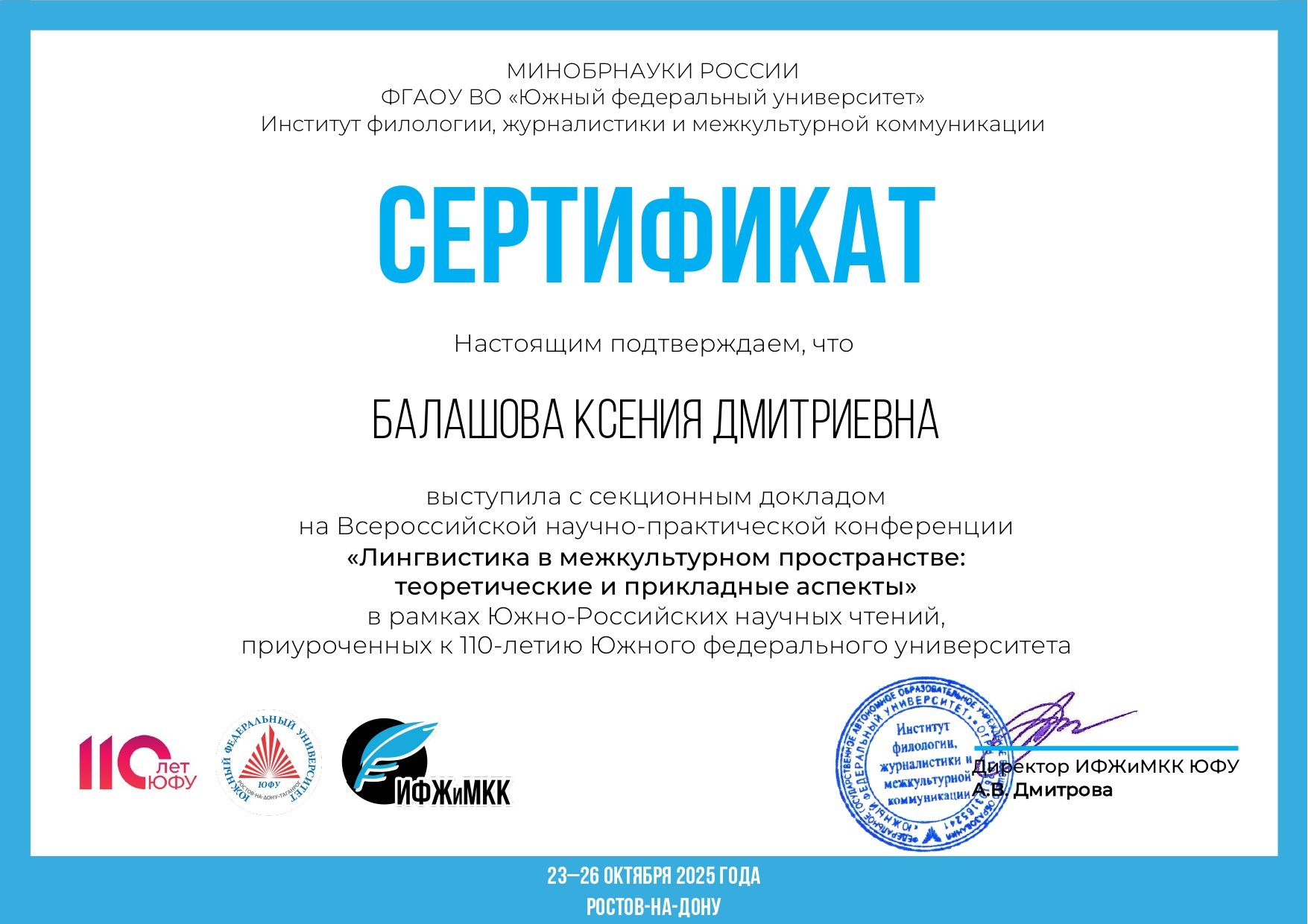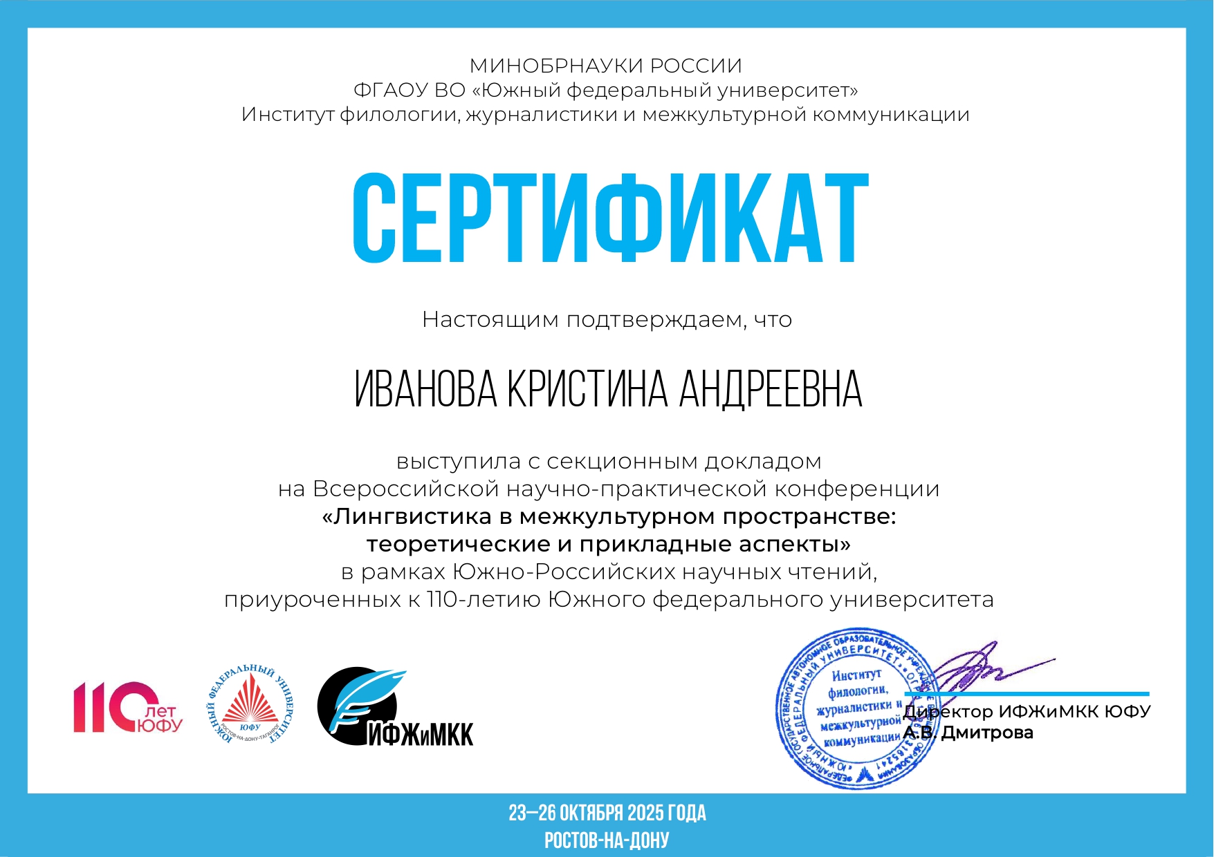 Осенью 2025 года активность магистра приобрела ещё более выраженный исследовательский характер: на Всероссийской научно-практической конференции «Лингвистика в межкультурном пространстве: теоретические и прикладные аспекты» в рамках Южно-Российских научных чтений (Южный федеральный университет, г. Ростов-на-Дону) Иванова К.А. выступила с секционным докладом, что свидетельствует не только о рецептивном, но и о продуктивном включении в научную коммуникацию, а также о развитии навыков презентации собственных изысканий, что является ключевой образовательной задачей кружка.