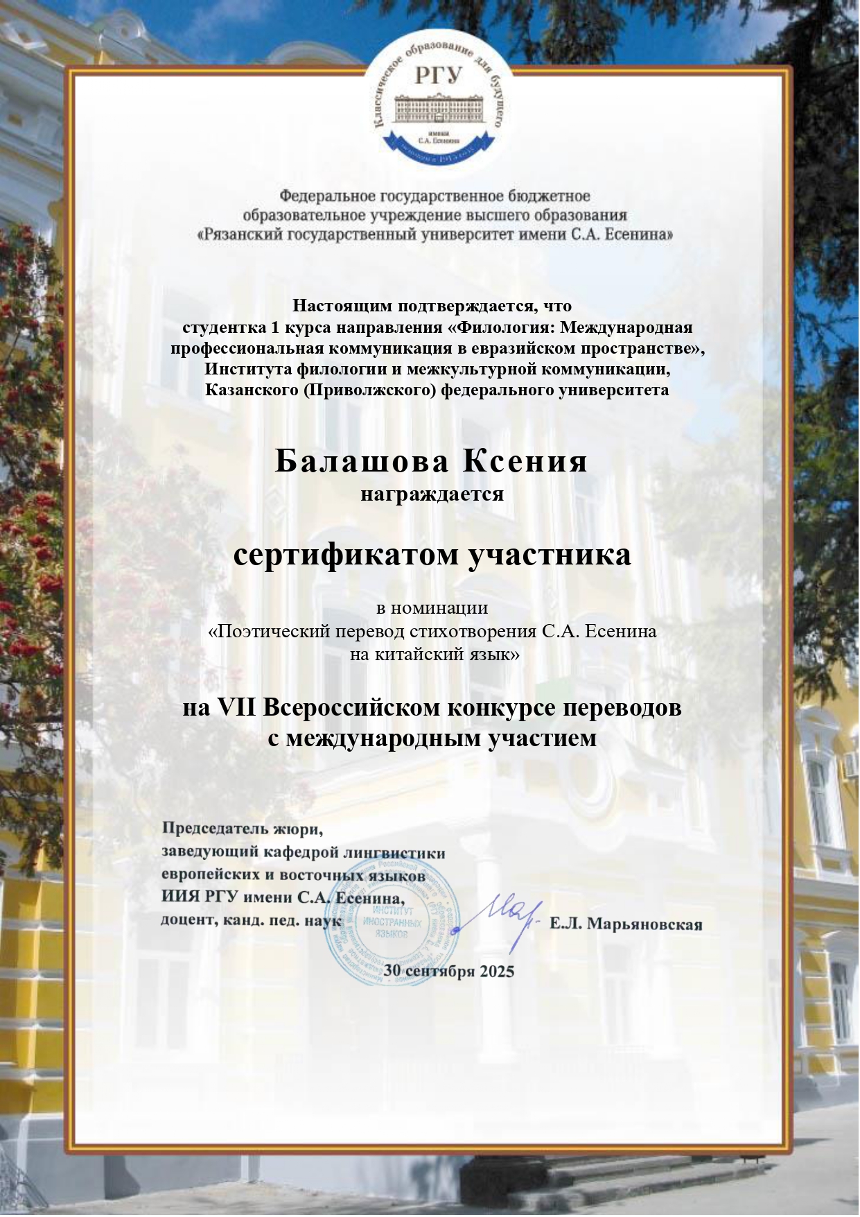 Активными участниками научных мероприятий в рамках тематики кружка также являются и другие члены «Lingua Oriens». Так, Балашова Ксения Дмитриевна выступила с секционным докладом на Всероссийской научно-практической конференции «Лингвистика в межкультурном пространстве» в Южном федеральном университете с темой: «Лингвистические риторические стратегии конструирования имиджа продукта в презентациях китайских смартфонов (на примере презентаций компании Huawei)». Её исследование напрямую связано с межкультурной коммуникацией, лингвистикой дискурса и прикладными аспектами филологии, что полностью соответствует направлениям работы кружка. Кроме того, Ксения Балашова проявила себя в творческо-переводческой номинации, получив сертификат участника VII Всероссийского конкурса переводов за поэтический перевод стихотворения С.А. Есенина на китайский язык, что подчёркивает её компетенции в области восточных языков и межкультурного взаимодействия.