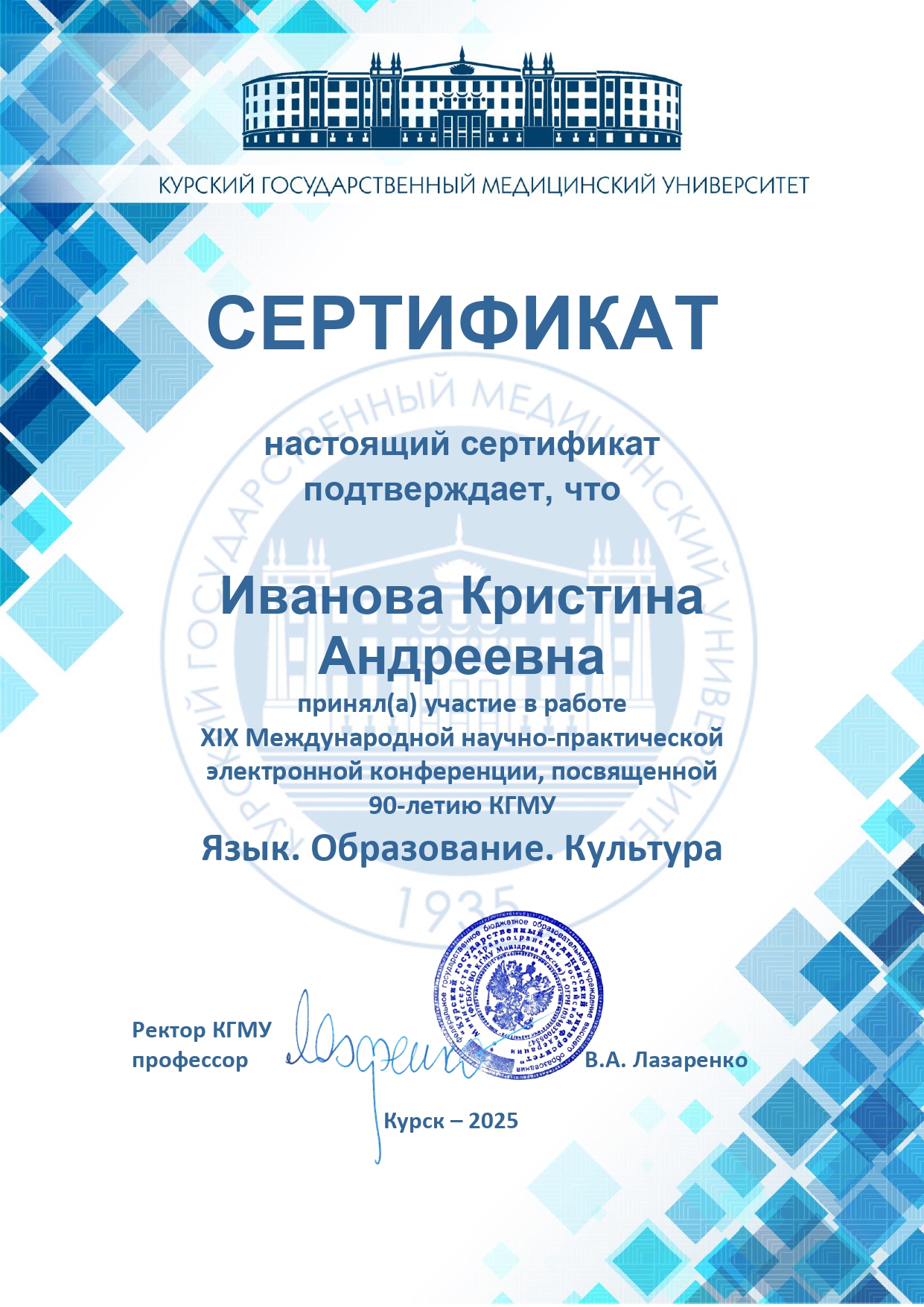 Кроме того, магистрант приняла участие в ХIХ Международной научно-практической электронной конференции «Язык. Образование. Культура», организованной Курским государственным медицинским университетом. Данный формат демонстрирует адаптацию к современным цифровым форматам академического взаимодействия и готовность участвовать в дискуссиях, выходящих за рамки сугубо филологического контекста, в область образовательных и культурных практик.
