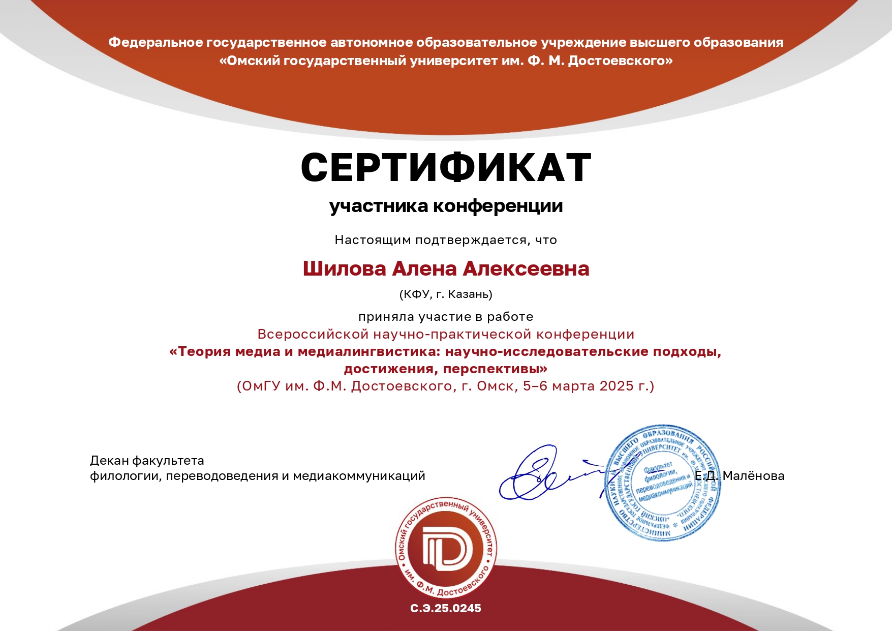 Ещё одним примером вовлеченности является участие Шиловой Алены Алексеевны во Всероссийской научно-практической конференции «Теория медиа и медиалингвистика: научно-исследовательские подходы, достижения, перспективы», организованной Омским государственным университетом им. Ф.М. Достоевского. Её участие в мероприятии, посвящённом медиалингвистике, отражает интерес к современным коммуникативным практикам и дискурсивному анализу, что также входит в спектр исследовательских интересов «Lingua Oriens».
