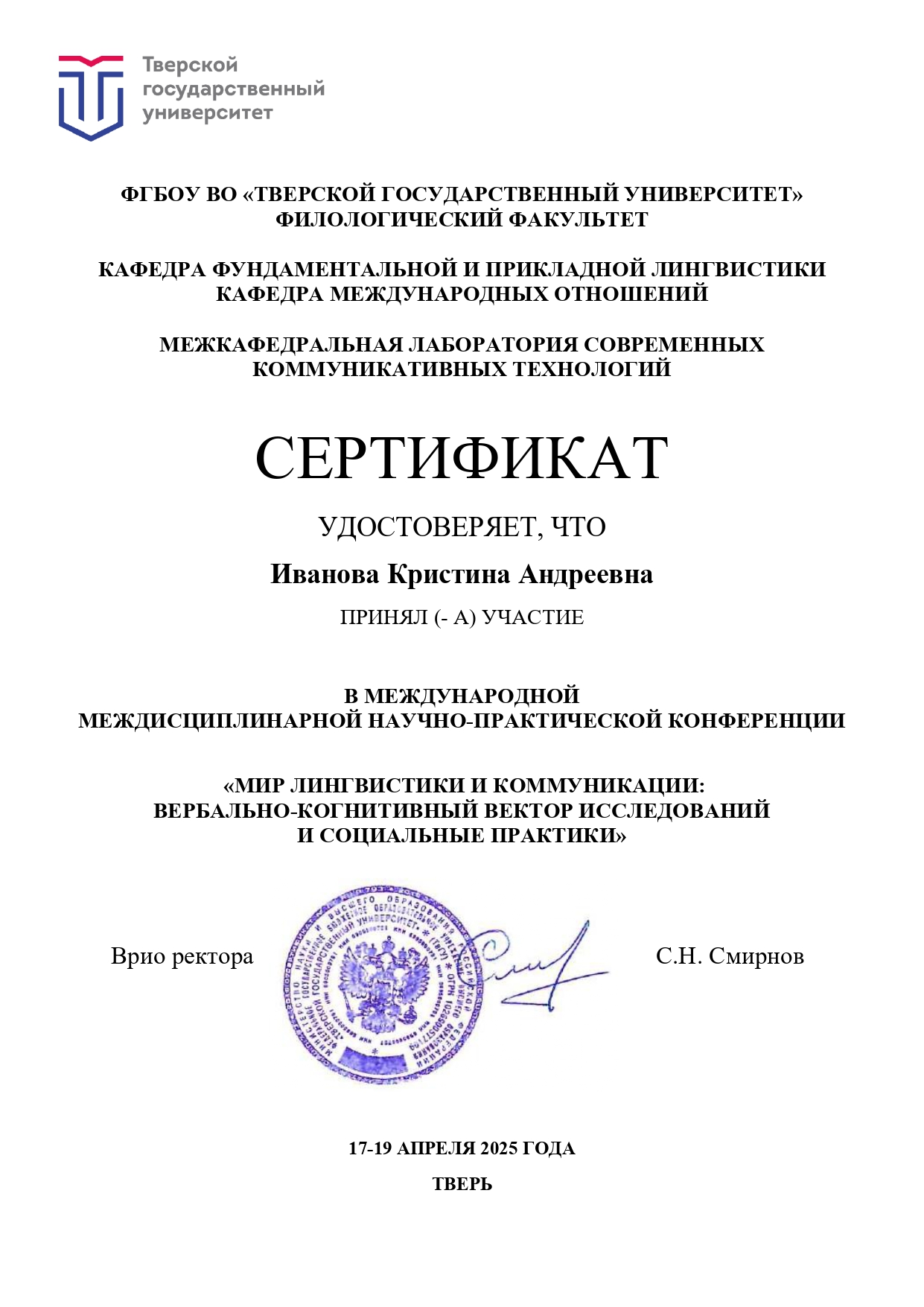 В апреле того же года состоялось её участие в Международной междисциплинарной научно-практической конференции «Мир лингвистики и коммуникации: вербально-когнитивный вектор исследований и социальные практики», проведённой Тверским государственным университетом. Это событие отразило выход на уровень интернационального диалога и работу на стыке лингвистических, когнитивных и социокультурных дисциплин, что непосредственно коррелирует с содержанием магистерской программы и исследовательскими векторами «Lingua Oriens».