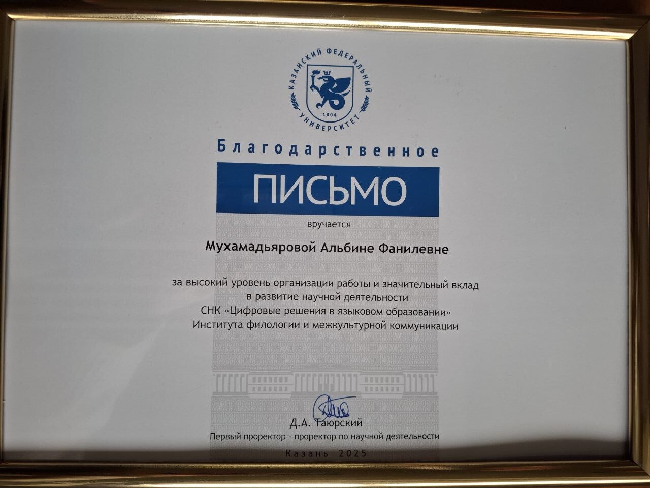 СНК «Цифровые решения в языковом образовании» успешно прошел все конкурсные испытания и награжден дипломом в номинации «За цифровизацию лингвометодики». Руководитель кружка Альбина Мухамадьярова отмечена благодарственный письмом за высокий уровень организации работы и значительный вклад в развитие научной деятельности Института филологии и межкультурной коммуникации.