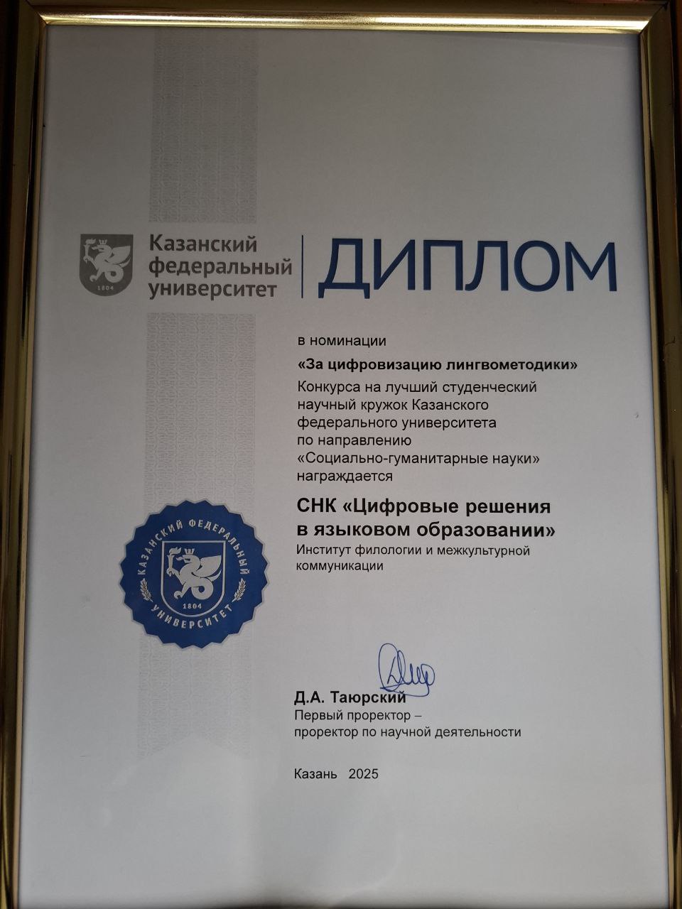 СНК «Цифровые решения в языковом образовании» отмечен дипломом в номинации «За цифровизацию лингвометодики» в конкурсе «Лучший студенческий научный кружок КФУ»