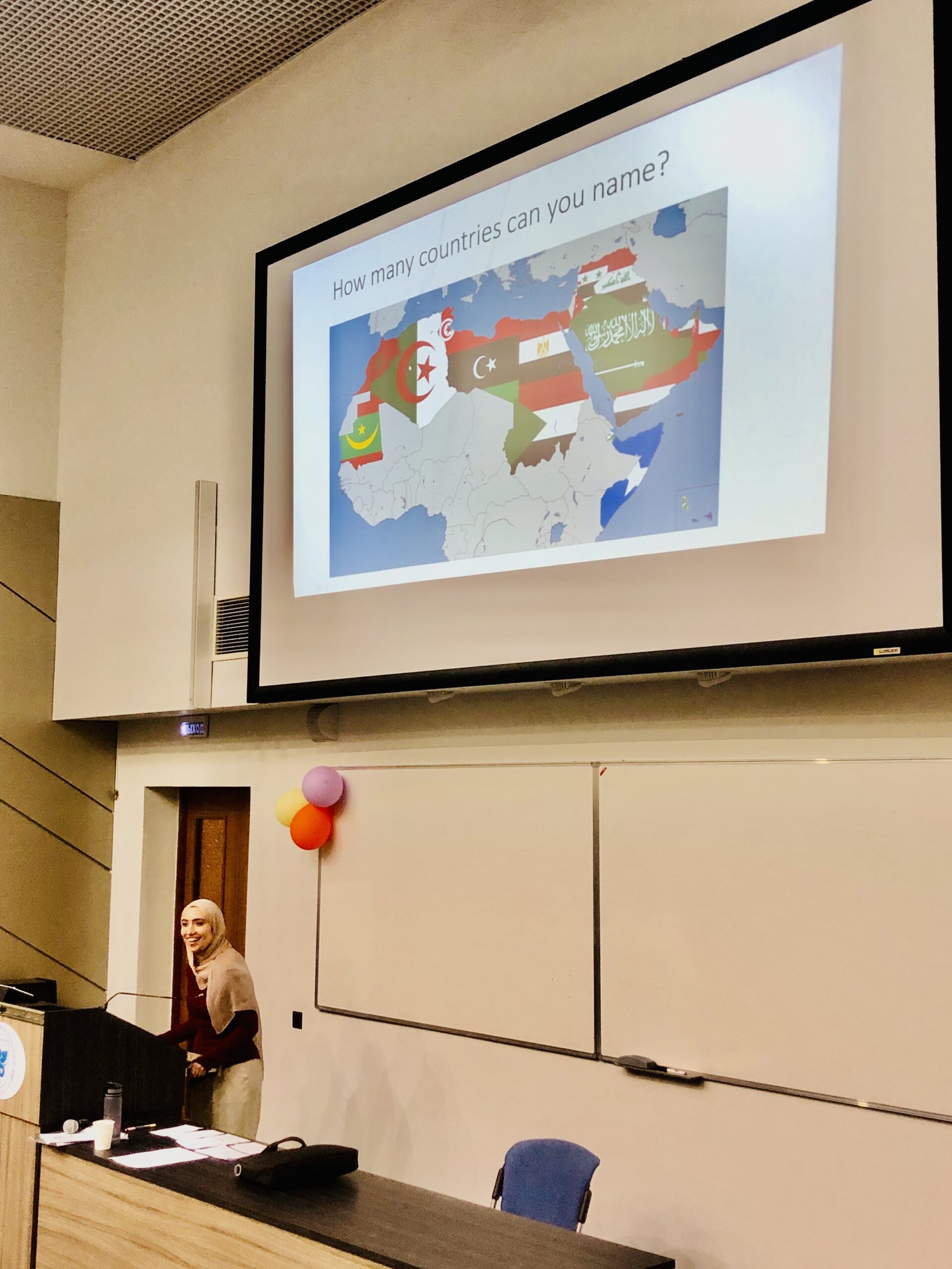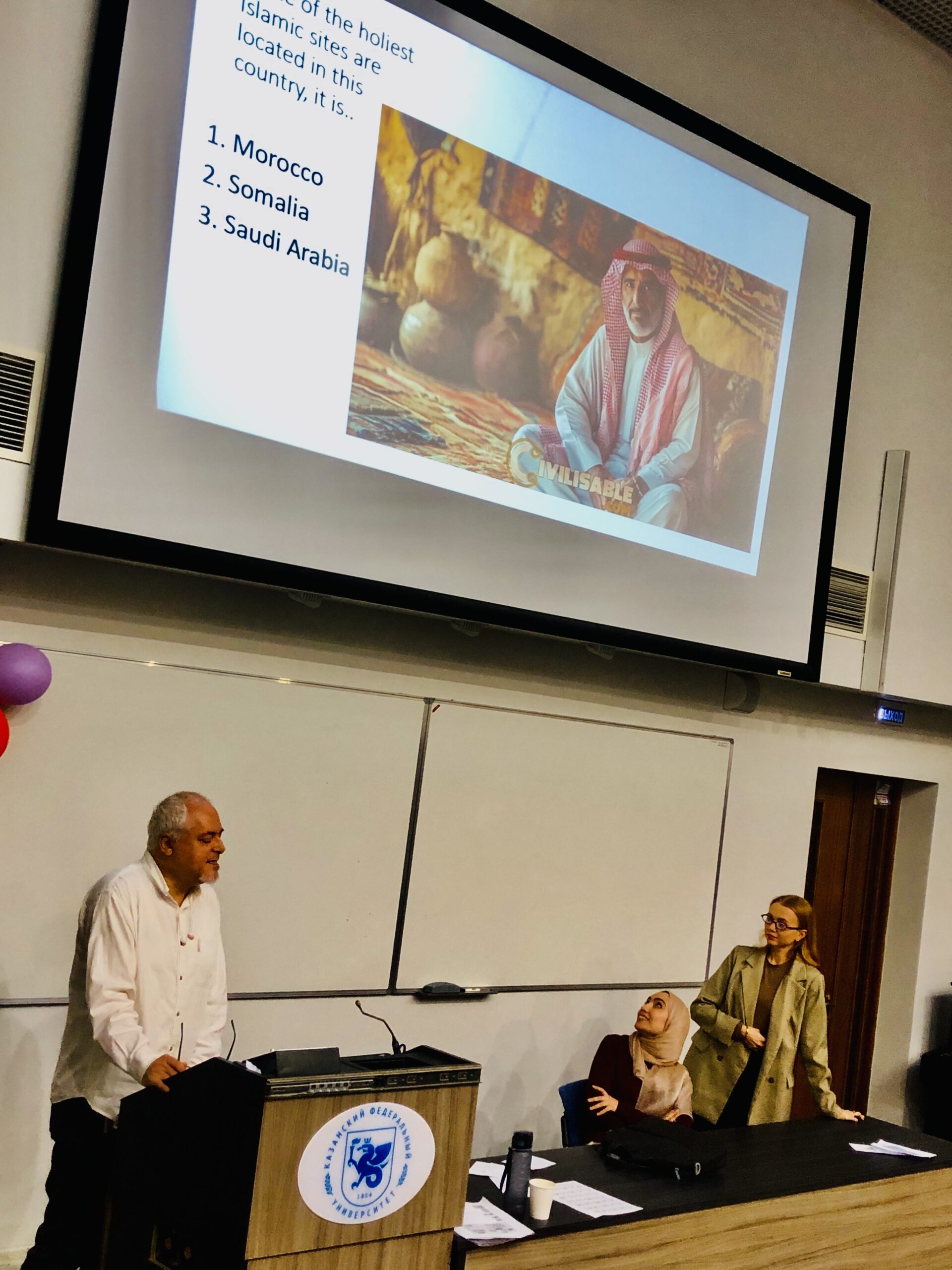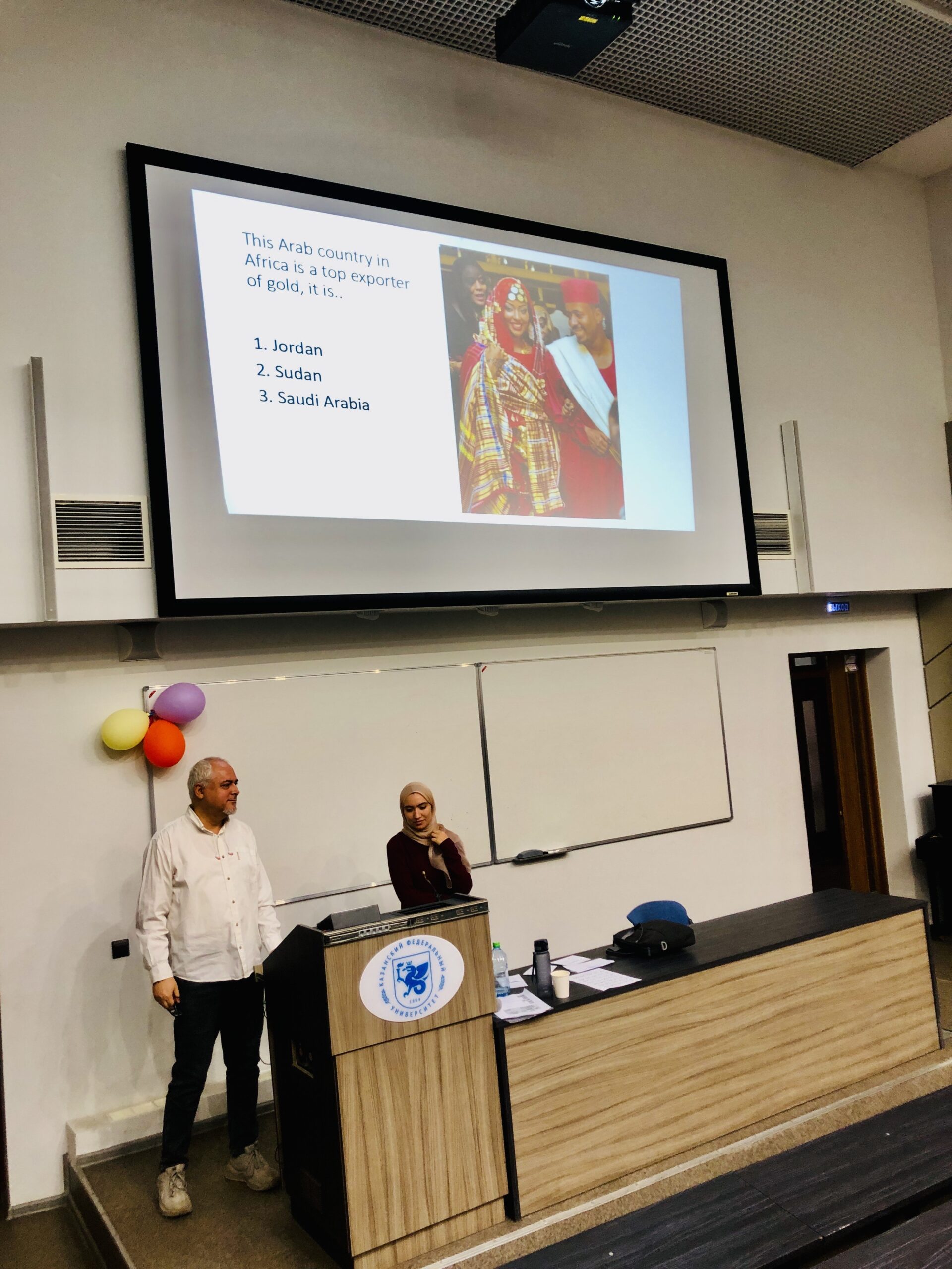Кульминацией мероприятия стала интеллектуальная игра на научную эрудицию «Bridging Cultures through Arabic Heritage» («Объединяя культуры через арабское наследие»). С докладами-презентациями в рамках этой темы выступили члены кружка Селсабил Хаддад (аспирант 2 года) и Бадур Фархад (ассистент кафедры). Их выступления были посвящены роли арабского лингвистического и культурного наследия в диалоге цивилизаций, что полностью соответствует контрастивной и межкультурной направленности работы кружка.