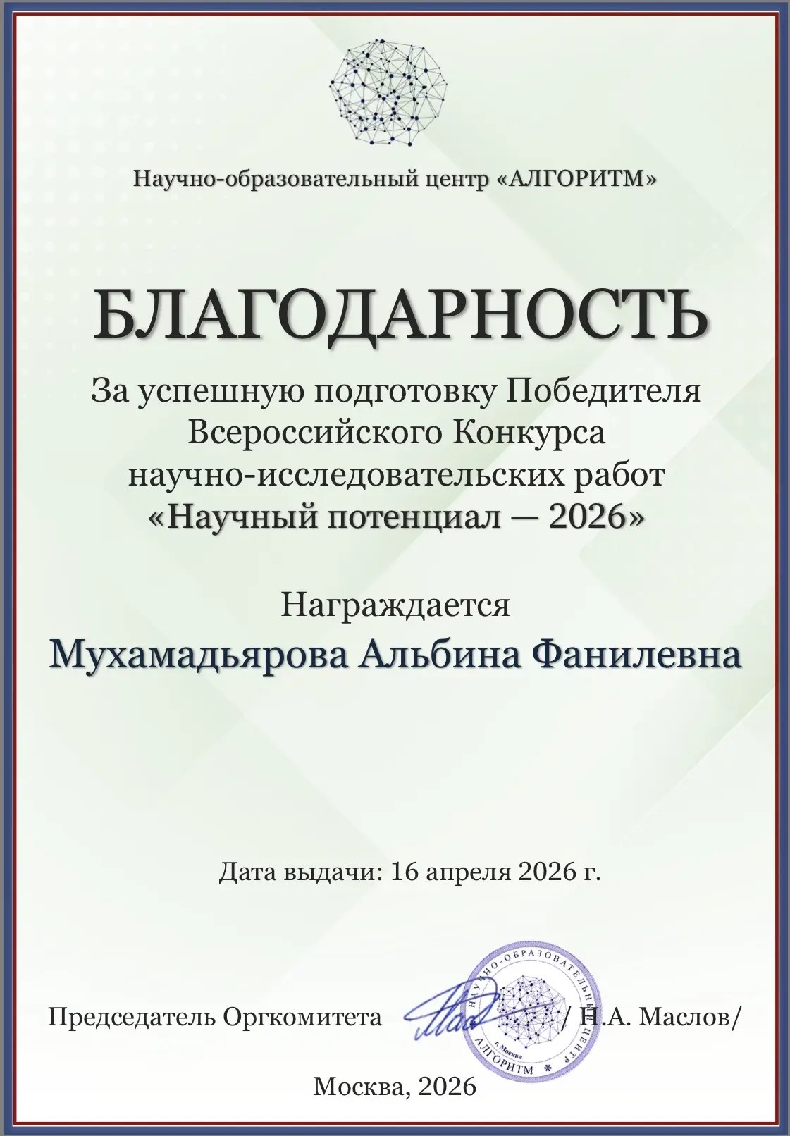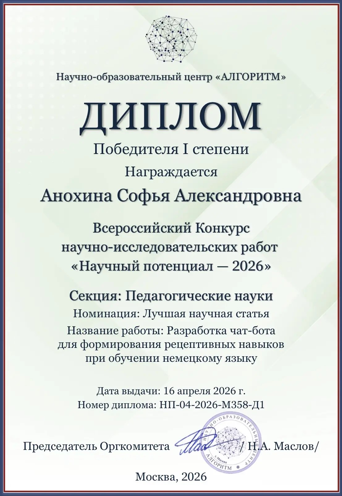 Участница СНК «Цифровые решения в языковом образовании», студентка 4 курса Софья Анохина приняла участие во Всероссийском конкурсе научно-исследовательских работ «Научный потенциал – 2026». Она представила исследование «Разработка чат-бота для формирования рецептивных навыков при обучении немецкому языку». Научным руководителем студентки выступила доцент кафедры теории и практики преподавания иностранных языков Альбина Мухамадьярова. Успешно выступив в номинации «Лучшая научная статья», Софья Анохина награждена дипломом победителя 1 степени.