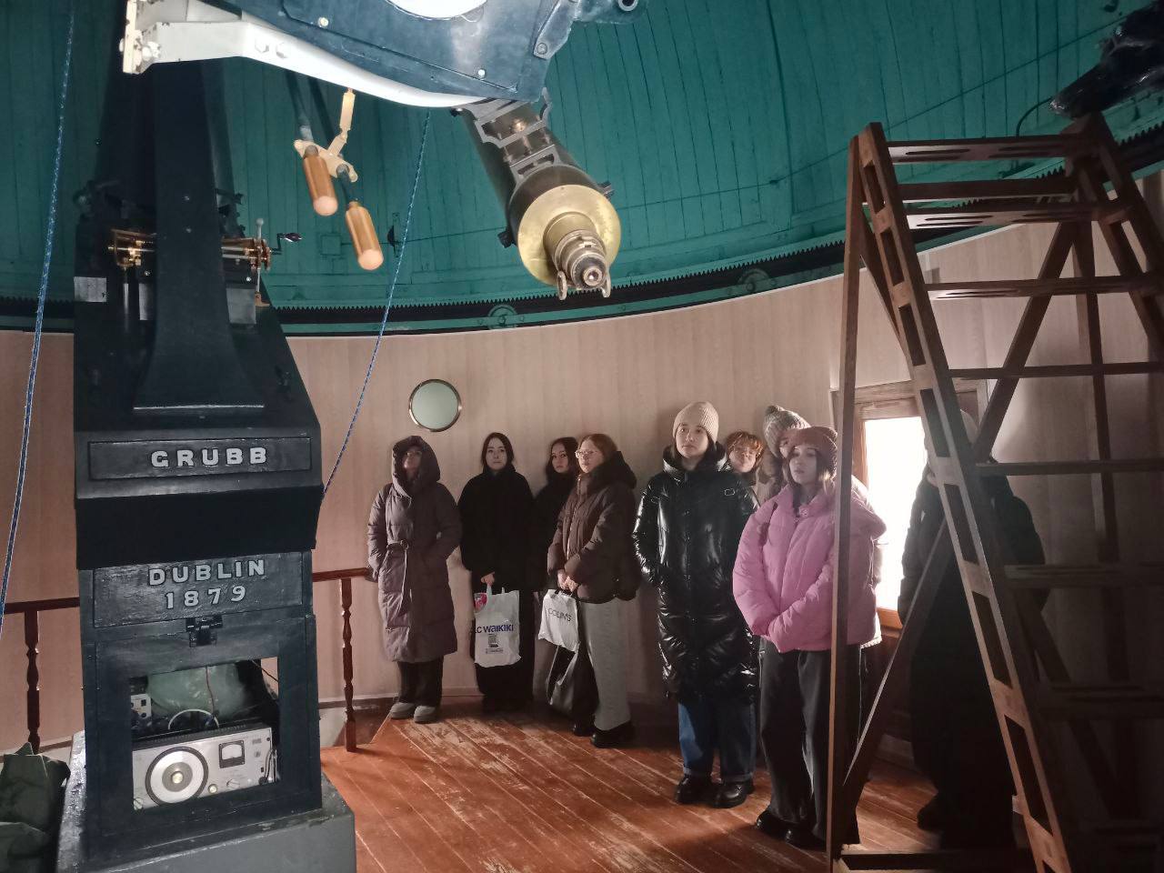 При осмотре экспонатов студенты увидели коллекцию телескопов, доставленных из Европы, а также главное здание обсерватории с уникальной архитектурой и механизмами вращающихся куполов.