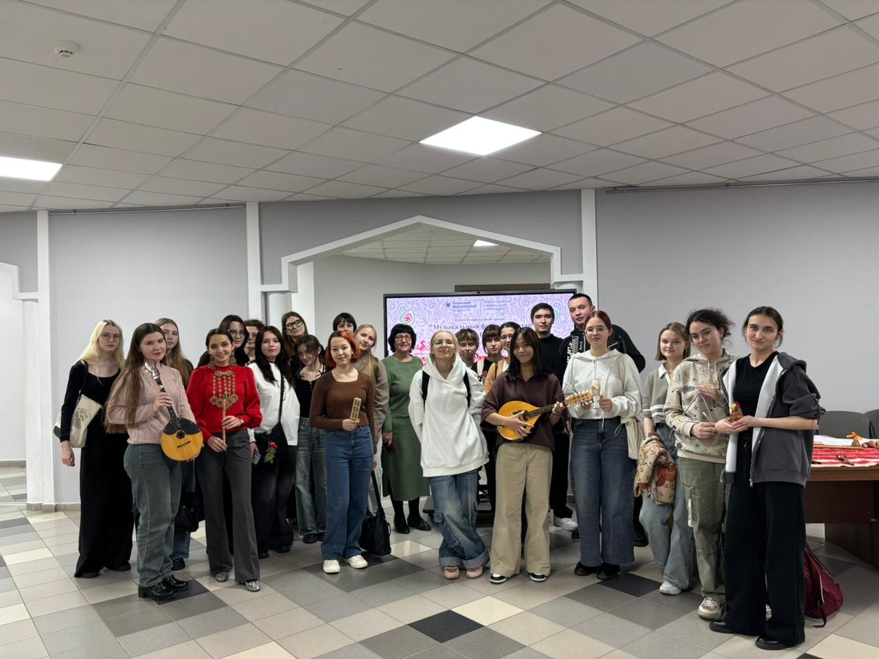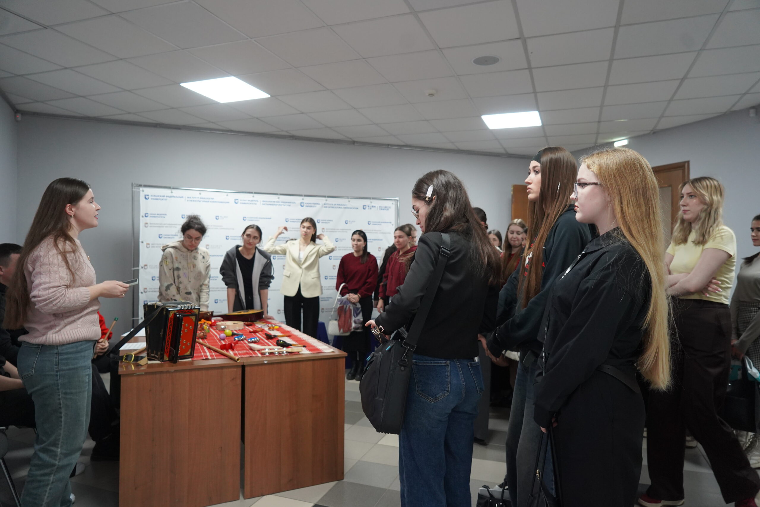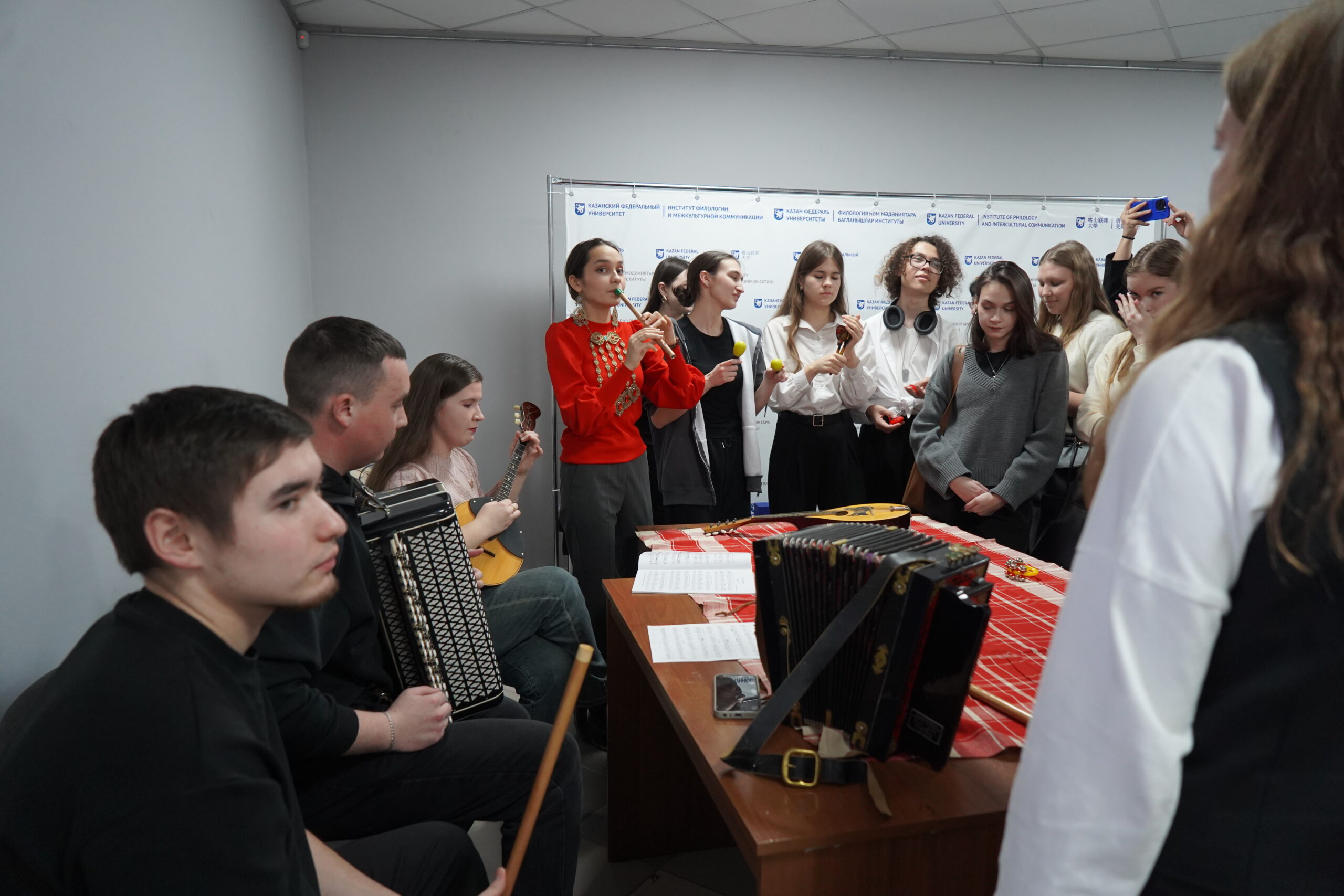 Презентация СНК «Музыкальный фольклор татар и народов Поволжья» была в формате мастер-класса исполнительского искусства. Студенты делились информацией и приемами мастерства исполнения на музыкальных инструментах народов Поволжья. У первокурсников была возможность поиграть на инструментах и быть на время участниками ансамбля.