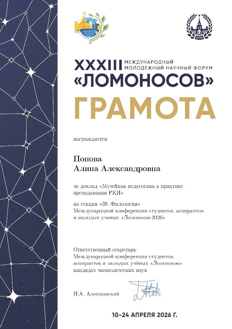 По итогам работы секции «Филология. Русский как иностранный. Теория и методика обучения» (подсекция «Функциональная лексикология и лингвокультурология. Общие и частные вопросы методики преподавания русского языка в иноязычной аудитории») победителем признана студентка ИФМК КФУ Попова Алина Александровна. Молодой исследователь удостоен грамоты за доклад на тему «Музейная педагогика в практике преподавания РКИ» (научный руководитель – к.ф.н., доцент Штырлина Е.Г.), который решением жюри был признан лучшим в секции. Научная значимость работы Поповой А.А. заключается в дополнении сведений о дидактическом потенциале учебных экскурсий в практике обучения русскому языку как иностранному, выявлении особенностей восприятия языкового и культурологического материала в музейной среде, а также в формулировании методологических подходов к интеграции экскурсий в систему обучения РКИ. Выступление студентки на конференции отличалось глубоким пониманием исследуемой проблематики, уверенным владением материалом, безупречной научной речью, а также способностью конструктивно вести дискуссию и давать исчерпывающие ответы на вопросы.