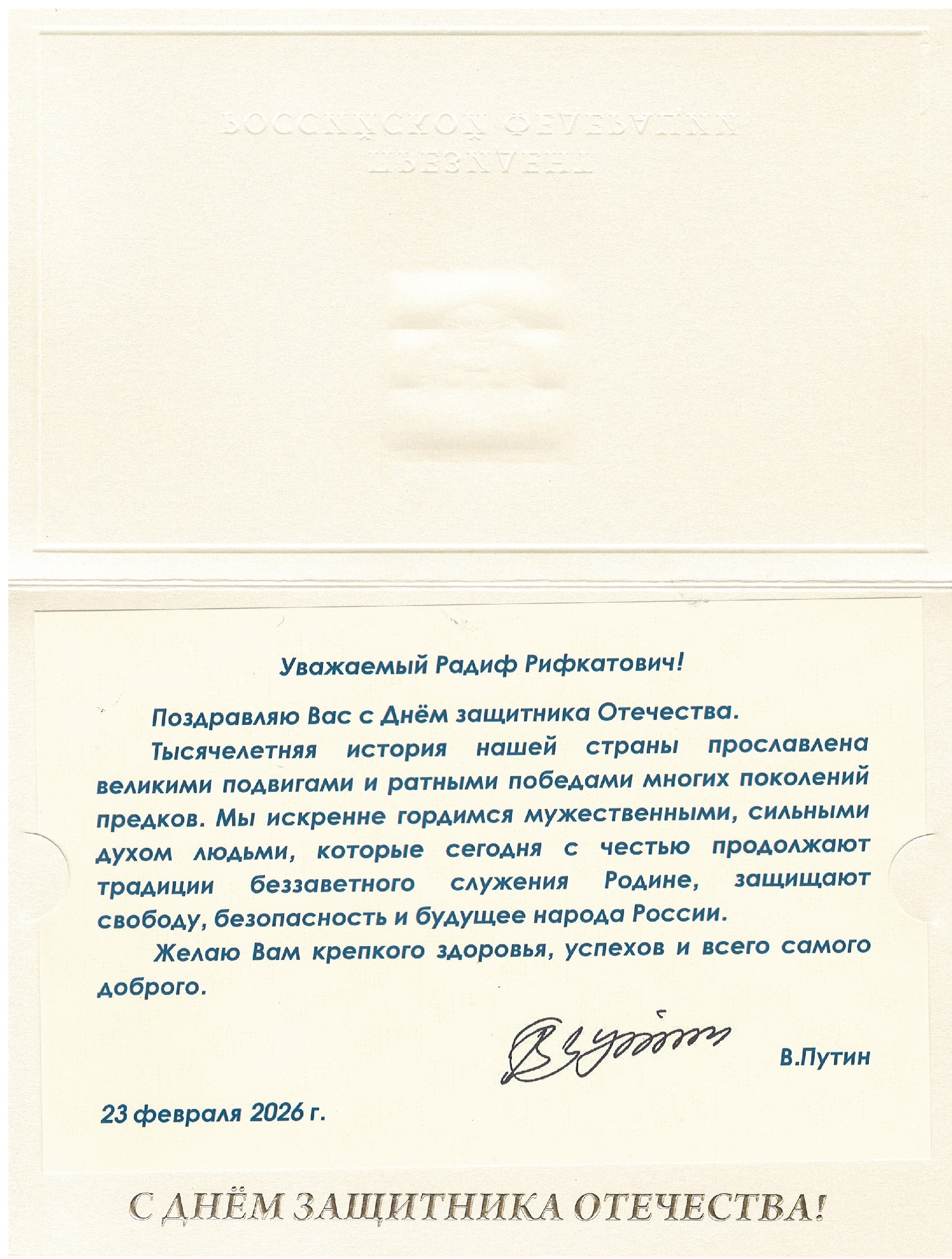 Поздравляю Вас с Днём защитника Отечества.