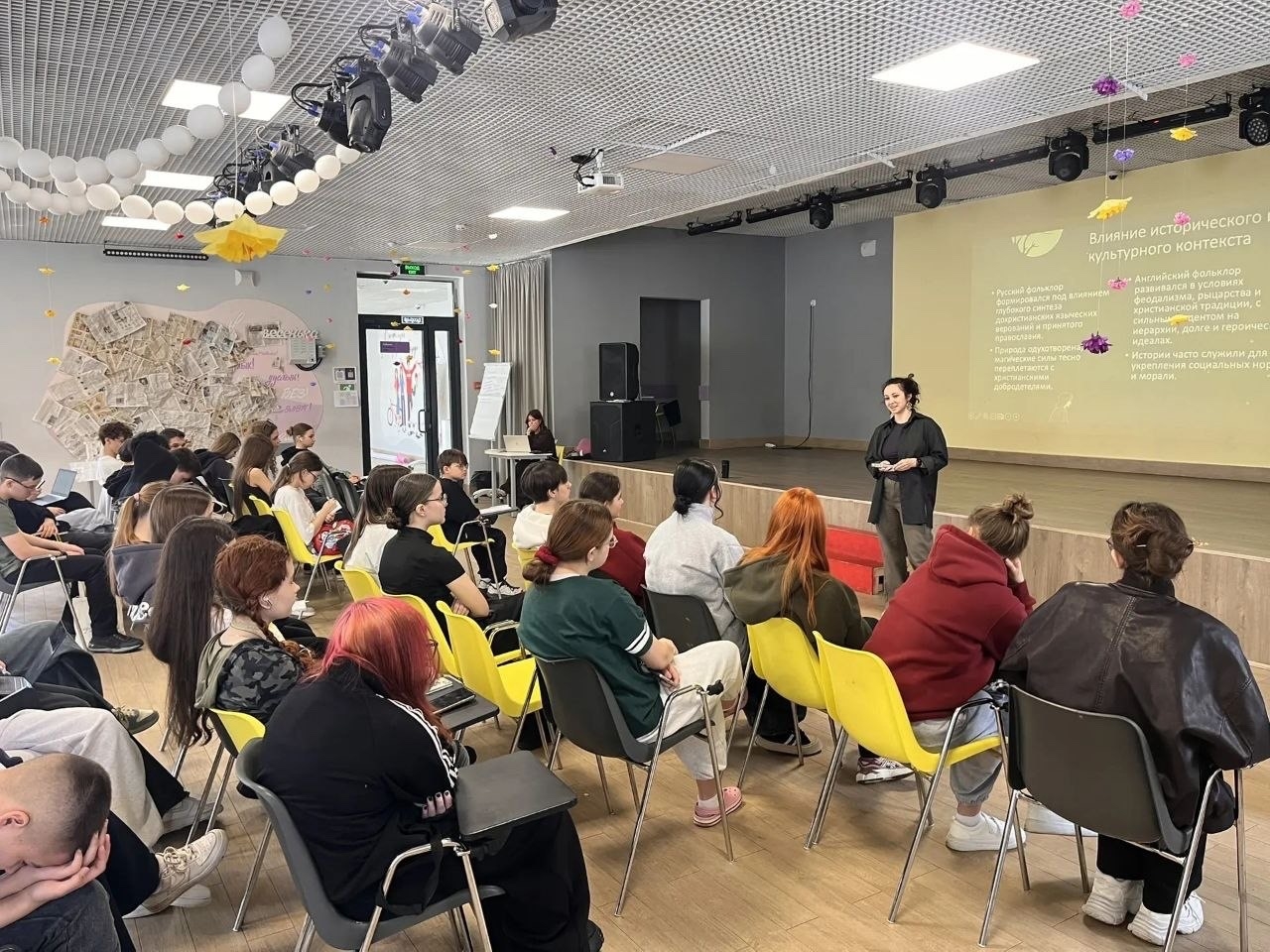 Карина Александровна рассказала о популярных сюжетах сказок в русском и английском фольклоре, ребята активно участвовали в обсуждениях, угадывали сказки и персонажей, а также проводили параллели с татарским фольклором. Участники познакомились с уникальными героями разных культур, порассуждали о различиях в мотивации и менталитете разных культур.