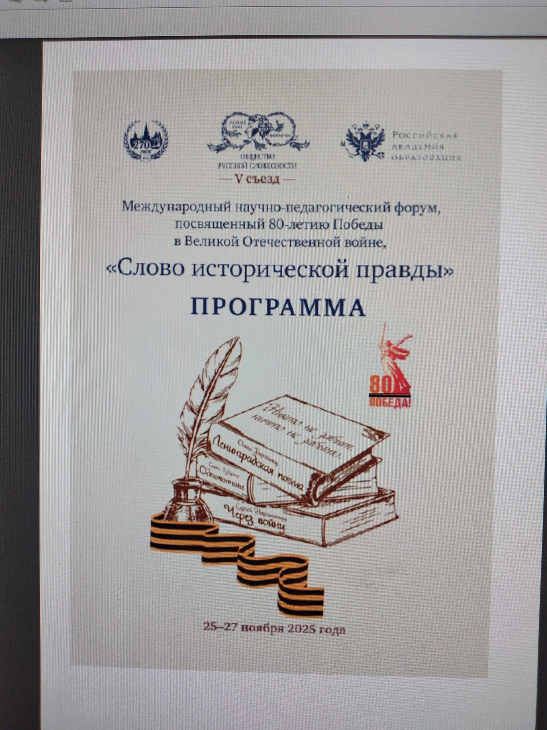 25-27 ноября 2025 года в Московском государственном университете имени М.В. Ломоносова прошли V Съезд Общества русской словесности, Международный научно-педагогический форум «СЛОВО ИСТОРИЧЕСКОЙ ПРАВДЫ», посвященный 80-летию Победы в Великой Отечественной войне, международная научно-практическая конференция «Русская словесность на международном научно-образовательном и культурном пространстве».