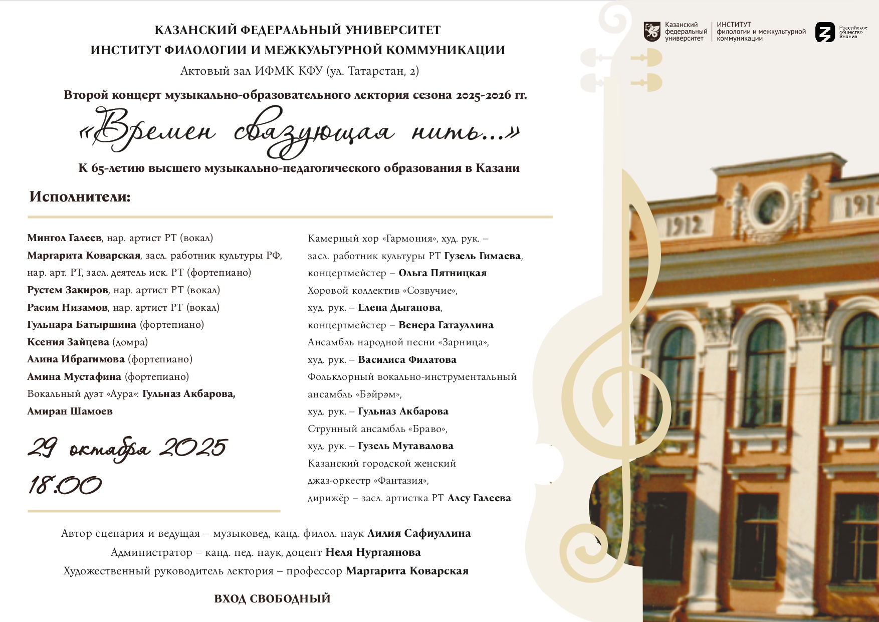 29 октября 2025 года в Институте филологии и межкультурной коммуникации КФУ состоится второй концерт музыкально-образовательного лектория под названием «Времён связующая нить…», посвященный 65-летию высшего музыкально-педагогического образования в Казани.