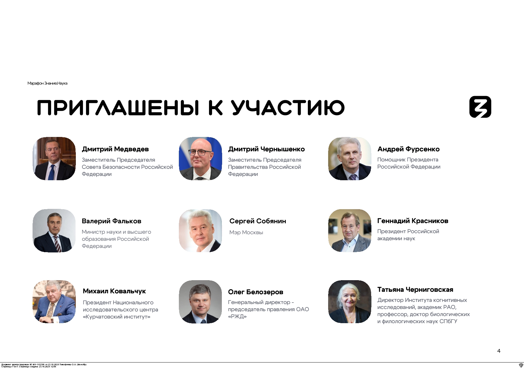 К участию в марафоне приглашены заместители председателя правительства Российской Федерации Дмитрий Патрушев, Дмитрий Чернышенко, Виталий Савельев, заместитель Председателя Совета Безопасности Российской Федерации Дмитрий Медведев, мэр Москвы Сергей Собянин, министр науки и высшего образования РФ Валерий Фальков, известный ученый Татьяна Черниговская и другие лидеры мнений.