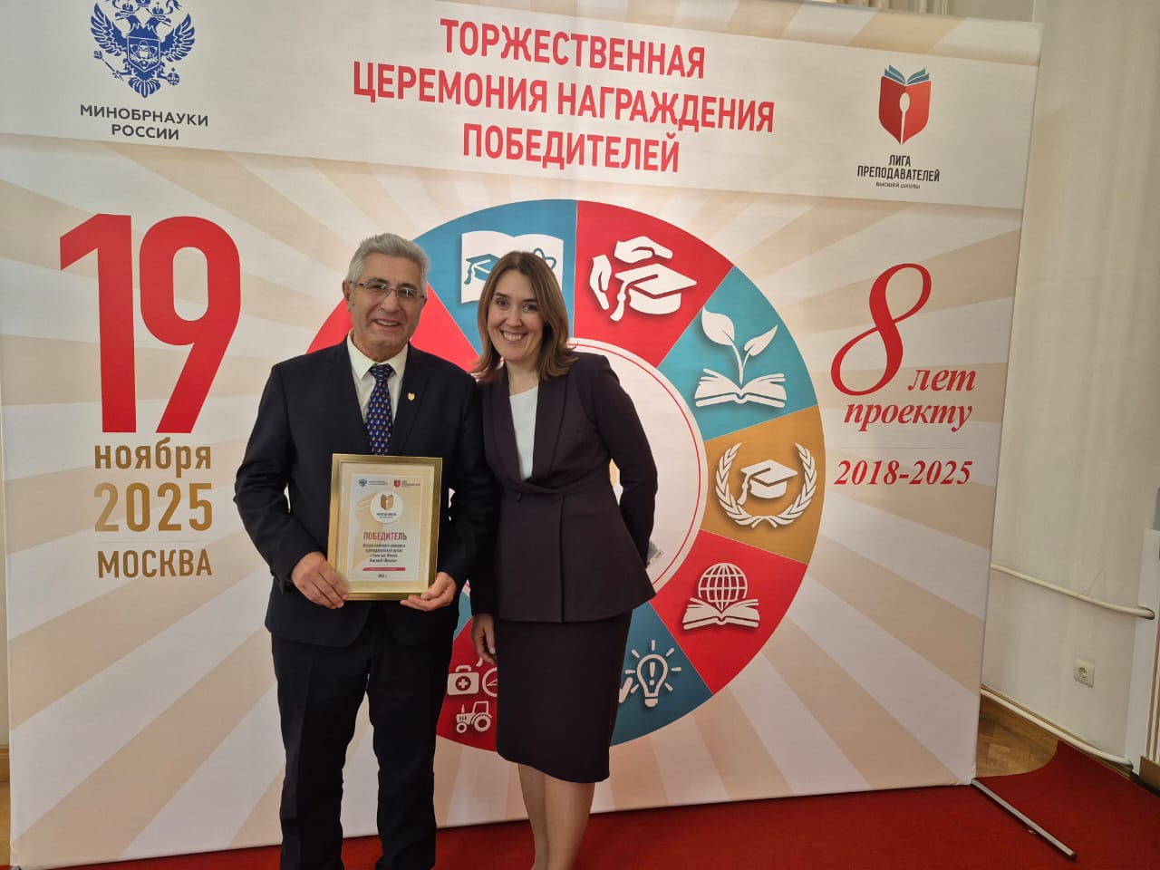 Конкурс, проводимый Лигой преподавателей высшей школы при поддержке Министерства науки и высшего образования РФ, ставит своей целью выявление и поддержку выдающихся педагогов, которые вдохновляют студентов и вносят значительный вклад в развитие образования и науки. Торжественная церемония награждения прошла в здании Министерства с участием депутатов Государственной Думы, ответственных работников Федерального собрания, Аппарата Президента РФ, Кабинета Министров РФ, Общественной палаты РФ, академиков РАН и РАО, зам. министра науки и высшей школы РФ О.В. Петровой и др.