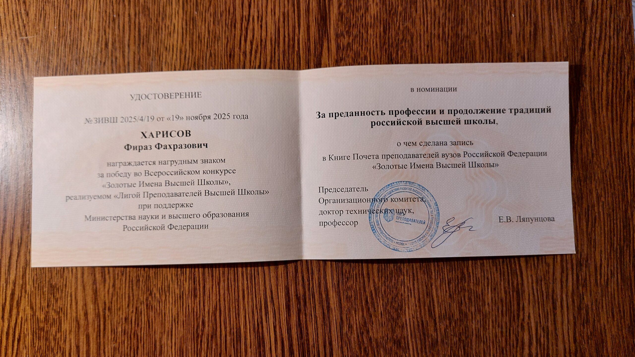 В ноябре 2025 года в Москве подвели итоги VIII Всероссийского конкурса «Золотые Имена Высшей Школы». Престижное мероприятие, объединившее более 2200 преподавателей из 76 регионов страны, выявило лучших из лучших. Среди них был отмечен профессор Казанского федерального университета Фираз Фахразович Харисов, ставший победителем в номинации «За преданность профессии и продолжение традиций российской высшей школы».