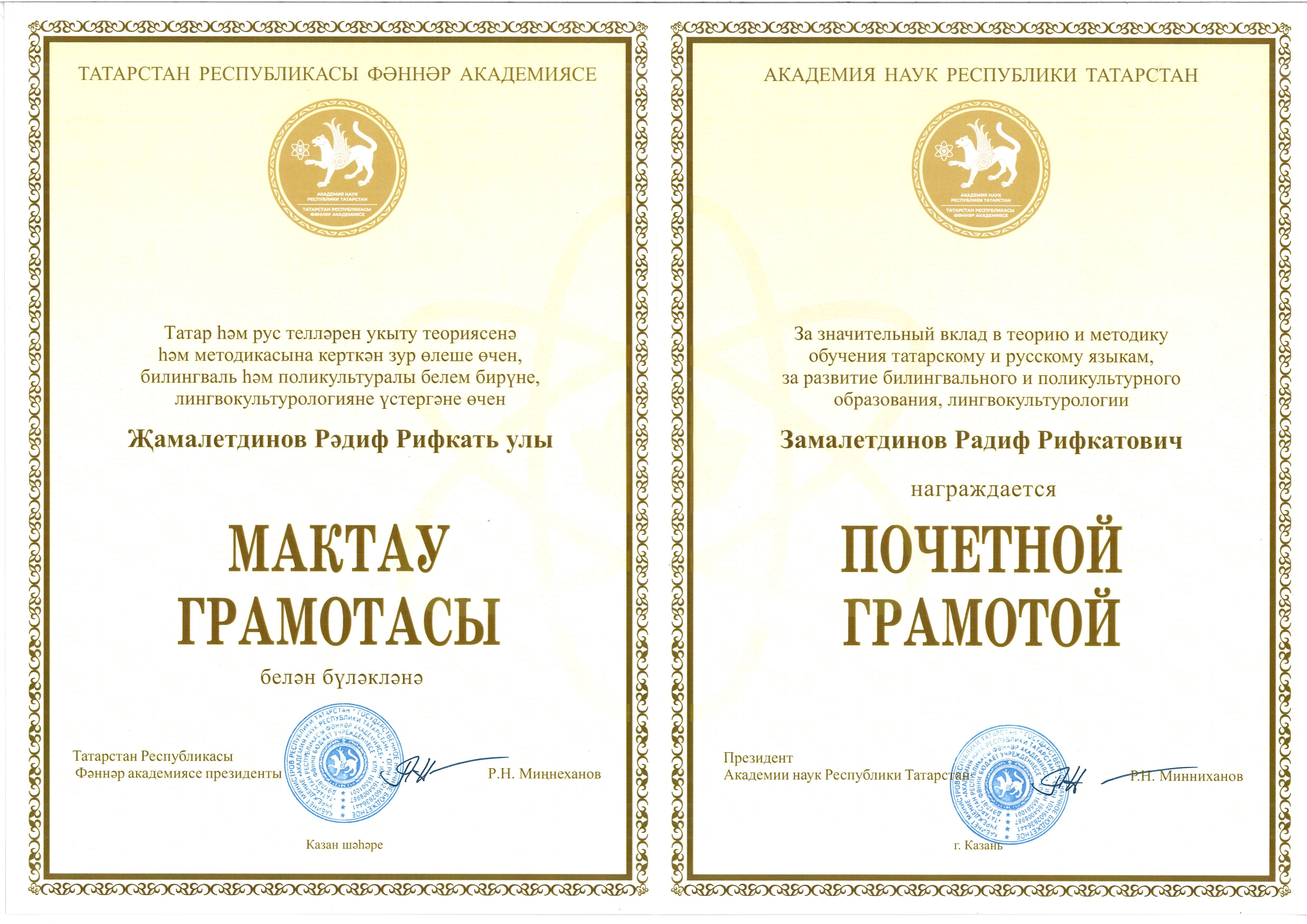 Президент Академии наук Республики Татарстан Рифкат Минниханов вручил Почетную грамоту директору Института филологии и межкультурной коммуникации КФУ, профессору Радифу Замалетдинову. Эта награда является признанием значительного вклада в развитие теории и методики обучения татарскому и русскому языкам. Работа профессора способствует укреплению билингвального и поликультурного образования, а также активно продвигает исследования в области лингвокультурологии.
