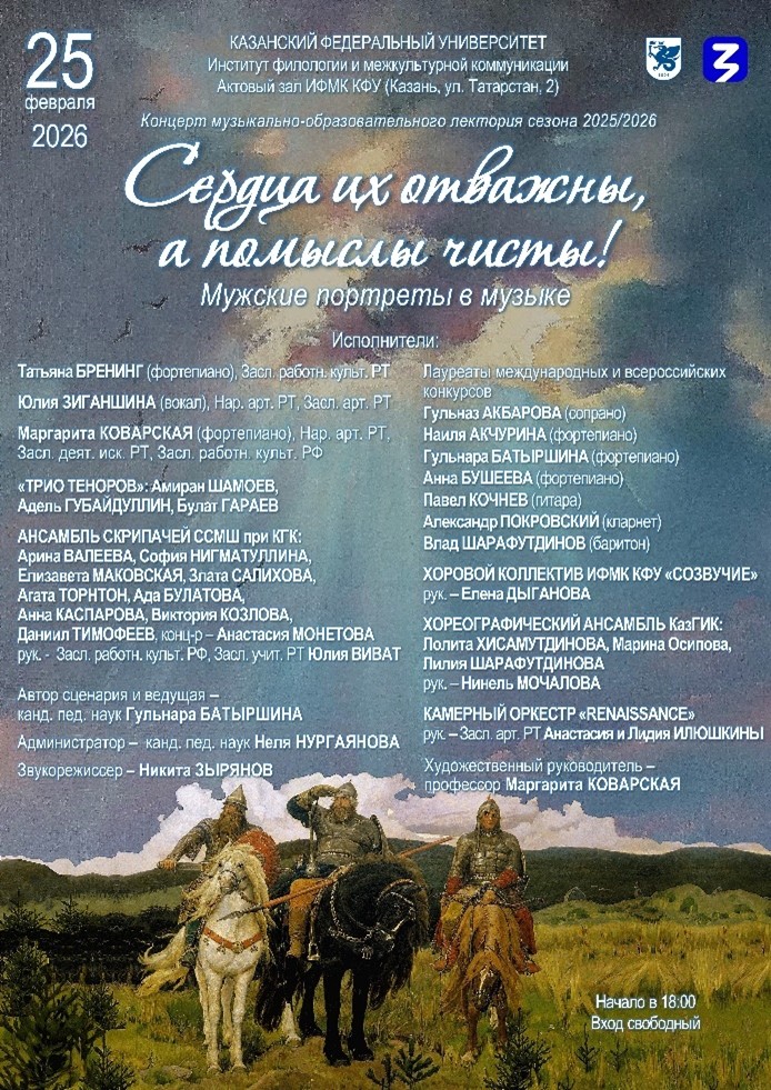 Концерт состоится в среду, 25 февраля 2026 года, в Актовом зале Института филологии и межкультурной коммуникации КФУ (ул. Татарстан, д. 2). Начало в 18 часов. Будем рады видеть Вас!