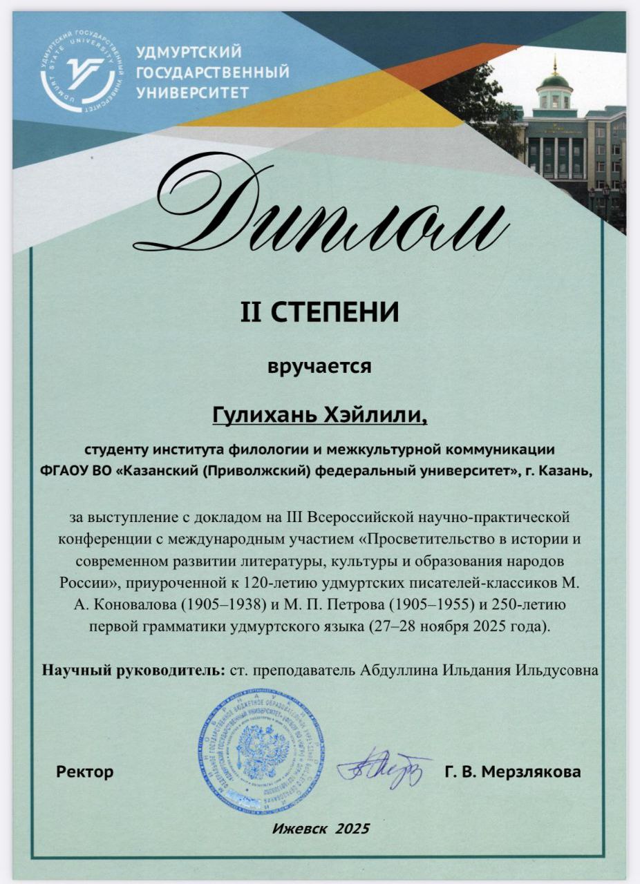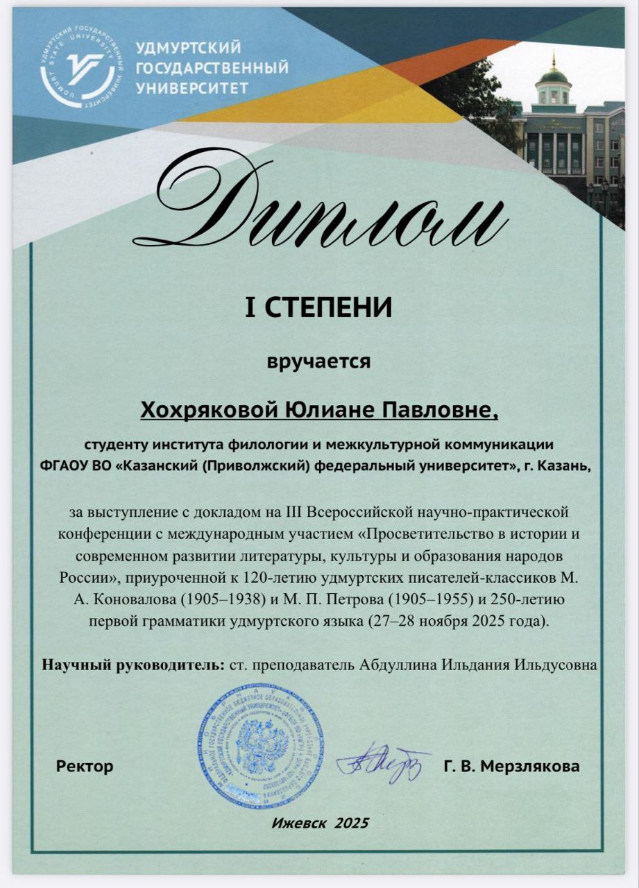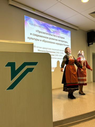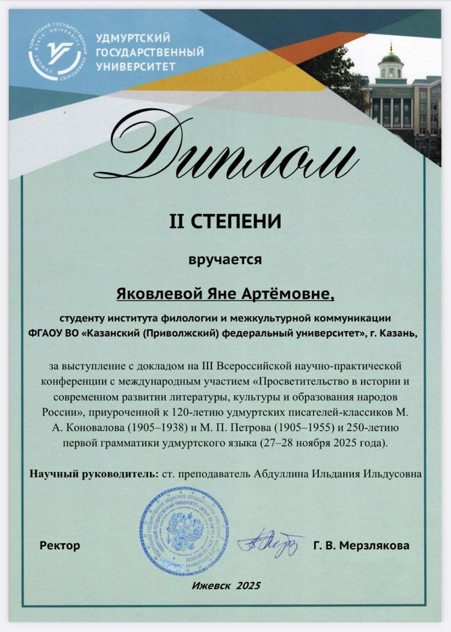 Под руководством старшего преподавателя кафедры русского языка и методики его преподавания Ильдании Абдуллиной студенты нашего Института активно приняли участие в III Всероссийской научно-практической конференции с международным участием, которая состоялась 27–28 ноября 2025 года в Удмуртском государственном университете. Конференция была приурочена к 120‑летию со дня рождения удмуртских писателей-классиков М. А. Коновалова (1905–1938) и М. П. Петрова (1905–1955), а также к 250‑летию первой грамматики удмуртского языка.
