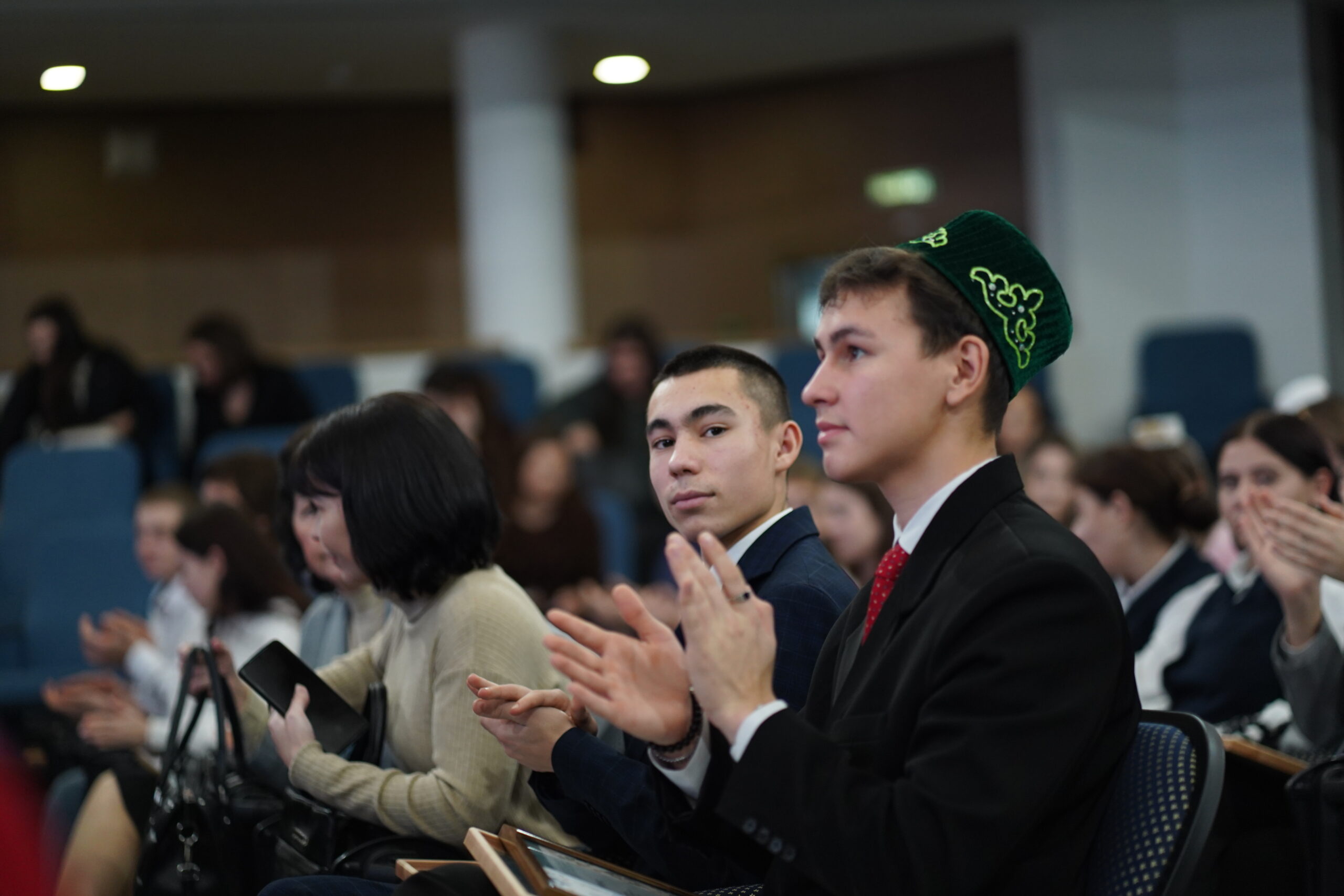 Особую, пронзительную ноту в программу вечера внесли творческие коллективы. Перед участниками Олимпиады выступили Студенческий театр «Мизгел» («Мгновение»), представивший отрывок из повести «Мы – дети 41-го года», и фольклорный вокально-инструментальный ансамбль «Бәйрәм». Их номера, наполненные искренностью и глубоким чувством, стали настоящим украшением вечера и были щедро награждены горячими аплодисментами благодарных зрителей.