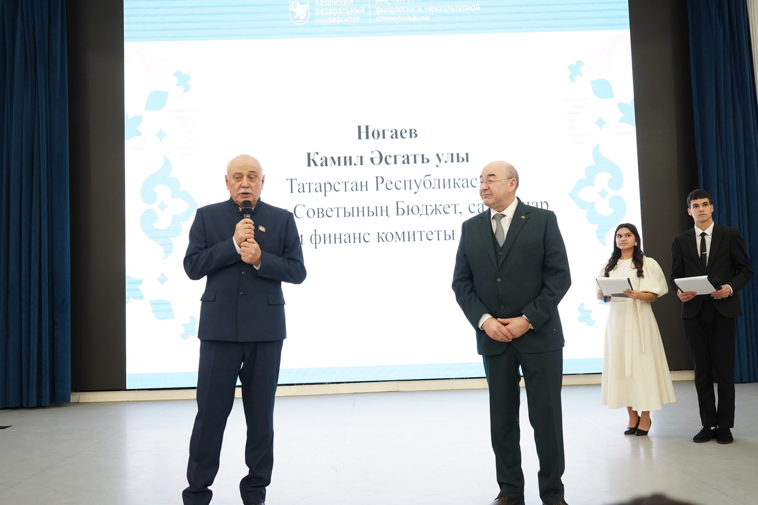 С приветственным словом и словами искренней благодарности к участникам обратился депутат Государственного Совета РТ Камиль Ногаев. Он отметил смелость и целеустремленность студентов, пожелавших испытать свои силы. Особый акцент Камиль Асгатович сделал на роли семьи и наставников: «Без поддержки родителей и домашнего воспитания невозможно достичь глубокого, осознанного владения языком. И, конечно, эта победа – огромная заслуга учителей, чей самоотверженный труд закладывает фундамент будущего нашей молодежи». Ранее, в интервью телеканалам, он поделился впечатлениями от визита делегации Татарстана в Республику Саха, где перенимался бесценный опыт по сохранению и развитию родных языков.