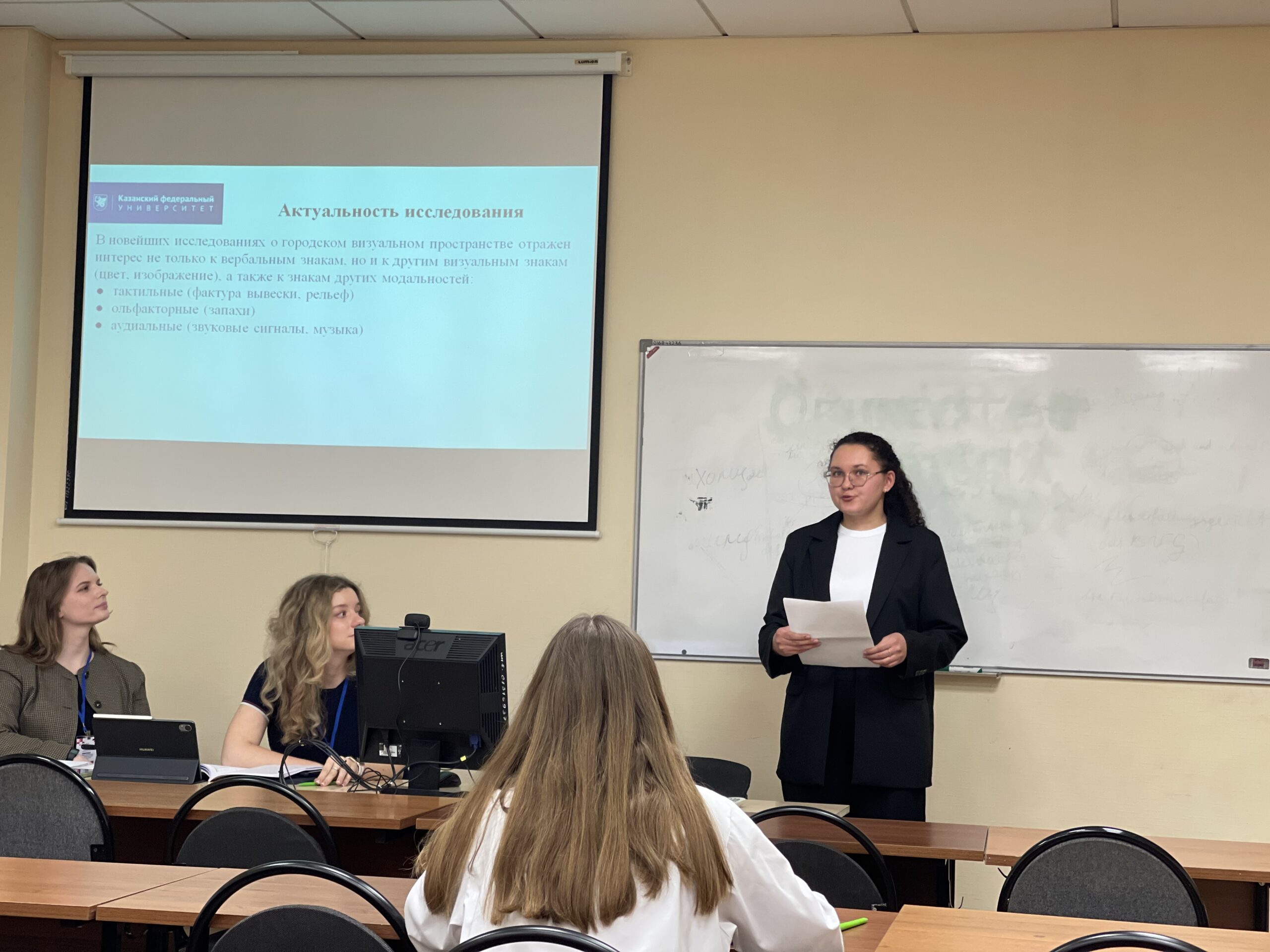 На студенческой секции «Потенциал» участники СНК «Лингвистический ландшафт мультилингвальных городов», студентки 1 курса направления 45.03.01 Филология, профиль «Прикладная филология: иностранный (английский) язык в международной коммуникации» Гафиятуллина Ольга Владиславовна и Солякова Екатерина Викторовна представили широкой академической аудитории результаты своих исследований мультизнаковых мультимодальных ландшафтов полилингвальных городов. В центре внимания в сравнительном аспекте оказались города Казань, Эдинбург (столица Шотландии) и Веллингтон (столица Новой Зеландии).