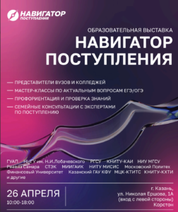 26 апреля в Казани пройдет крупнейшая образовательная выставка "Навигатор Поступления". Наш Институт филологии и межкультурной коммуникации будет принимать участие в выставке. Приглашаем Вас посетить мероприятие. Вы сможете задать любые вопросы о наших программах подготовки и правилах поступления, возможностях практики и трудоустройства, студенческой жизни и, конечно, задать любые волнующие вас вопросы!