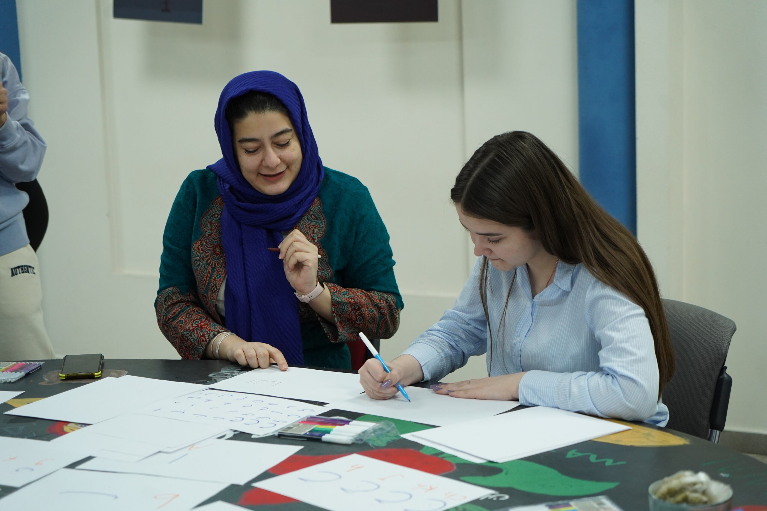 Ассистент кафедры теории и практики преподавания иностранных языков Фатима Мохсени Ниари и аспирантка второго года обучения Хаддад Селсабил показали волшебство арабской каллиграфии. Любой желающий мог сделать первые шаги в изучении языка и уже собственноручно написать свое имя.