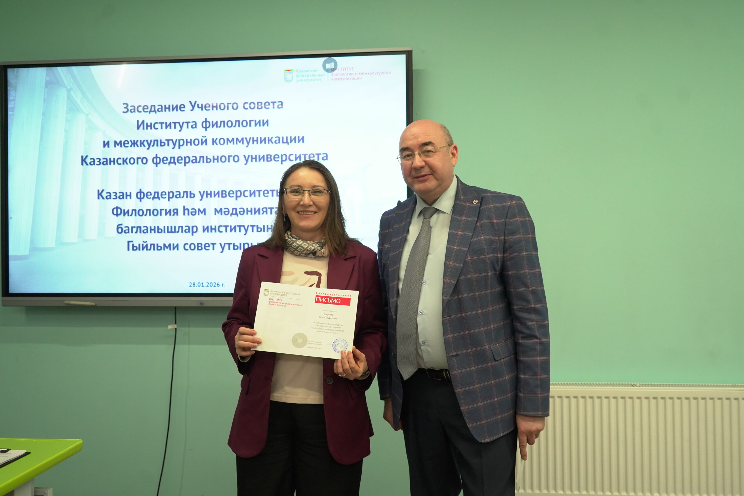 На заседании состоялось награждение благодарственными письмами от имени ректора КФУ Ленара Сафина. За добросовестный труд и реализацию дополнительных образовательных программ были отмечены сотрудники Центра непрерывного образования «Логос» ИФМК КФУ ведущий специалист Индира Ирисметова и специалист Вероника Гардер, за умелую работу в реализации образовательного процесса – специалист по учебно-методической работе Центра сопровождения образовательной деятельности ИФМК КФУ Алина Замилова.
