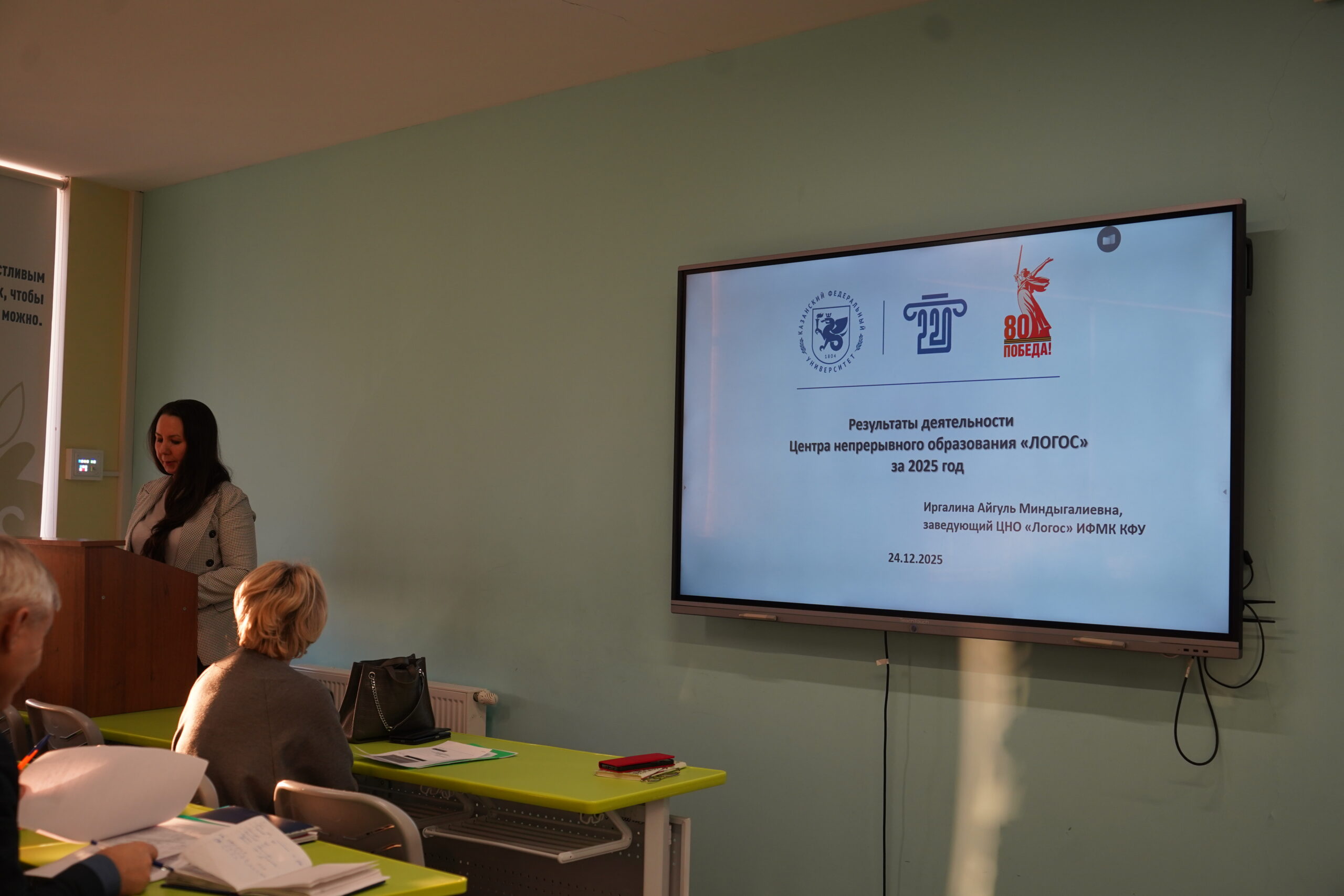 Руководитель Центра непрерывного образования «Логос» Айгуль Иргалина обозначила основные направления деятельности подразделения, среди которых разработка и реализация дополнительных образовательных программ, координация деятельности центров дополнительного образования, организация курсов повышения квалификации НПР ИФМК в Корпоративном центре КФУ, координация проекта «Цифровые кафедры». Кроме того, были предоставлены результаты мониторинга всех центров дополнительного образования Института