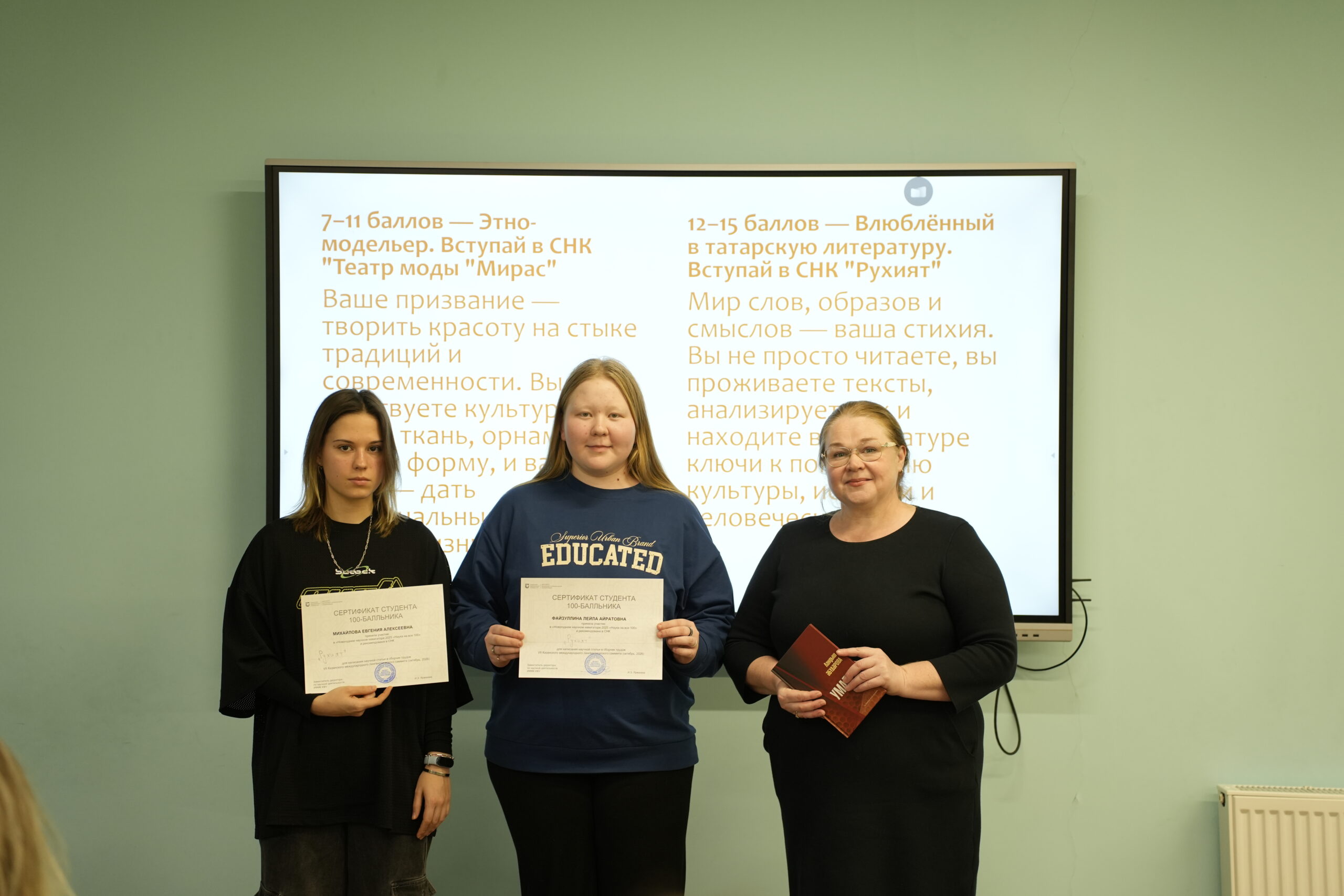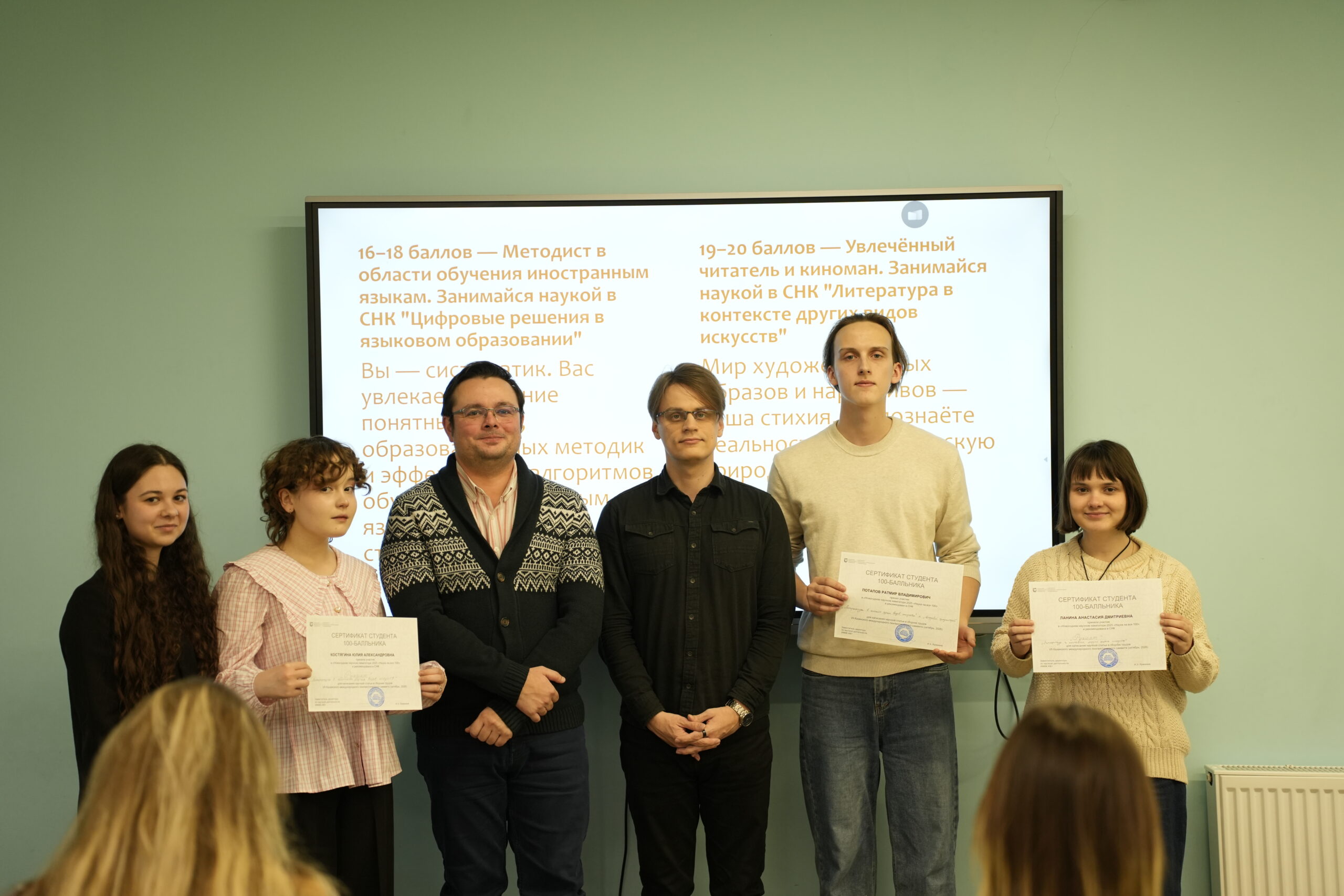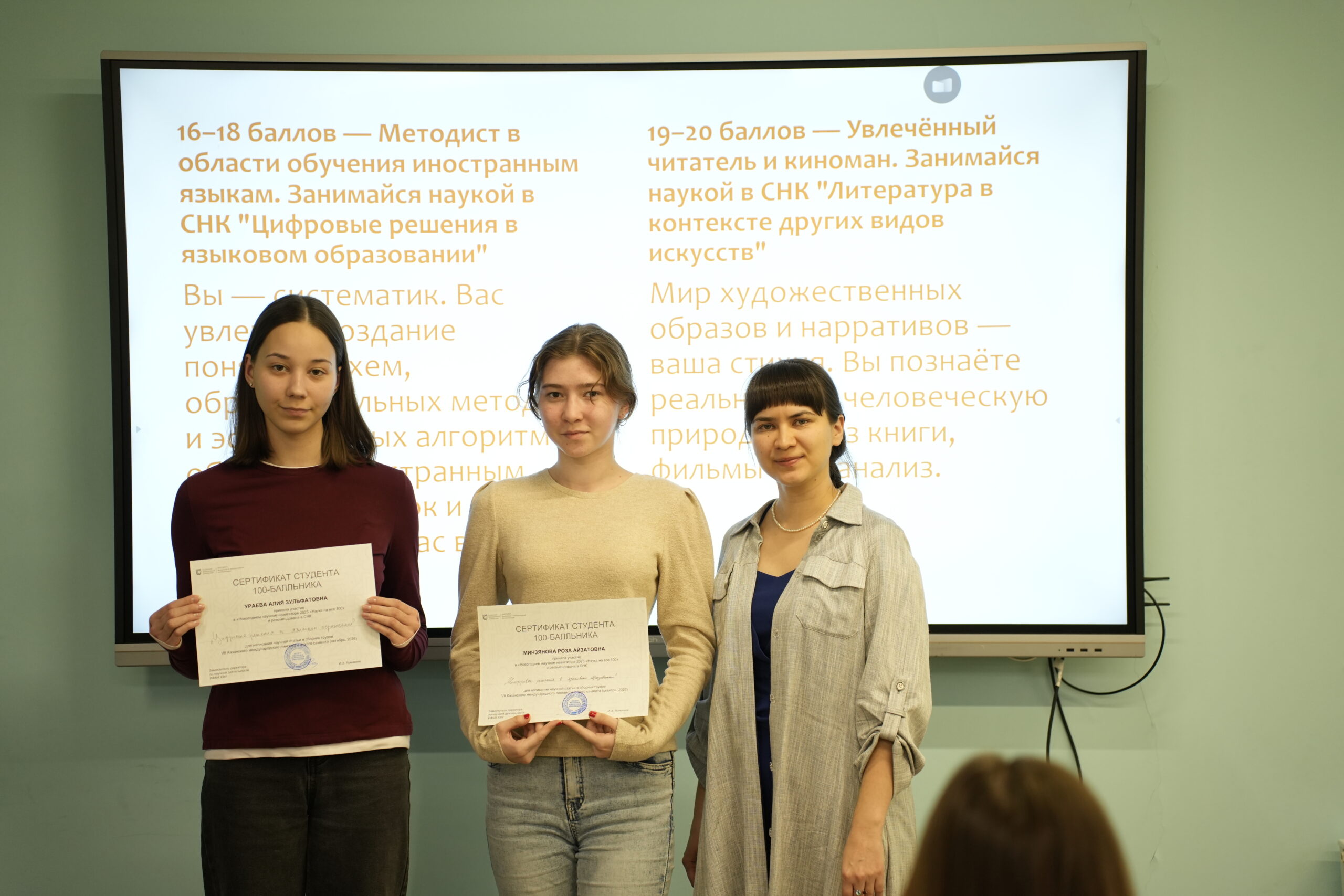 В Институте филологии и межкультурной коммуникации Казанского федерального университета состоялся пилотный запуск проекта «Наука на все 100» для студентов 1 курса. На первой встрече присутствовали студенты 100-балльники.