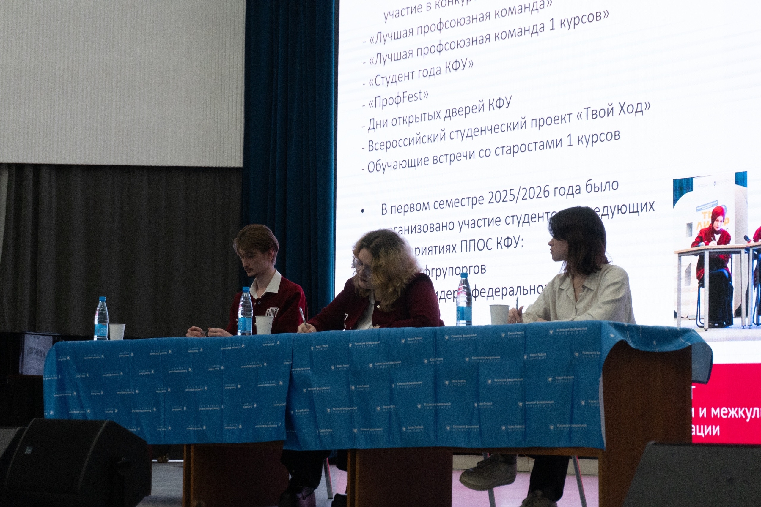 На конференции кандидаты на выборные должности представили свои программы на ближайшее время. После проведения тайного голосования стали известны имена избранных. Пост Председателя студенческого совета заняла Ларионова Алёна, студент 4 курса Высшей школы русской филологии и культуры им. Льва Толстого, прошедшая путь от активиста до председателя студенческого совета; в своих планах она обозначила развитие брендовых мероприятий и пути развития самоуправления. На пост Председателя Профбюро избрана Видина Анастасия, студент 2 курса Высшей школы русской филологии и культуры им. Льва Толстого; в своей программе она сделала акцент на доступности информации о ее предстоящем направлении и увеличении числа вступаемости в профсоюз. На пост Председателя антикоррупционной комиссии вступила Сиразиева Камилла, студент 3 курса Высшей школы национальной культуры и образования им. Г. Тукая, танцор коллектива «ArtWorks», ранее занимавшая пост заместителя председателя антикоррупционной комиссии. Также в ходе конференции произошли кадровые изменения в ряде направлений: руководителем СМИ стала Вахонина Аделина, а руководителем профориентационного направления студенческого совета — Гимадутдинов Арсений. Кроме того, свои полномочия завершили профорг Афанасьева Софья и руководитель антикоррупционного направления Шитова Анастасия.