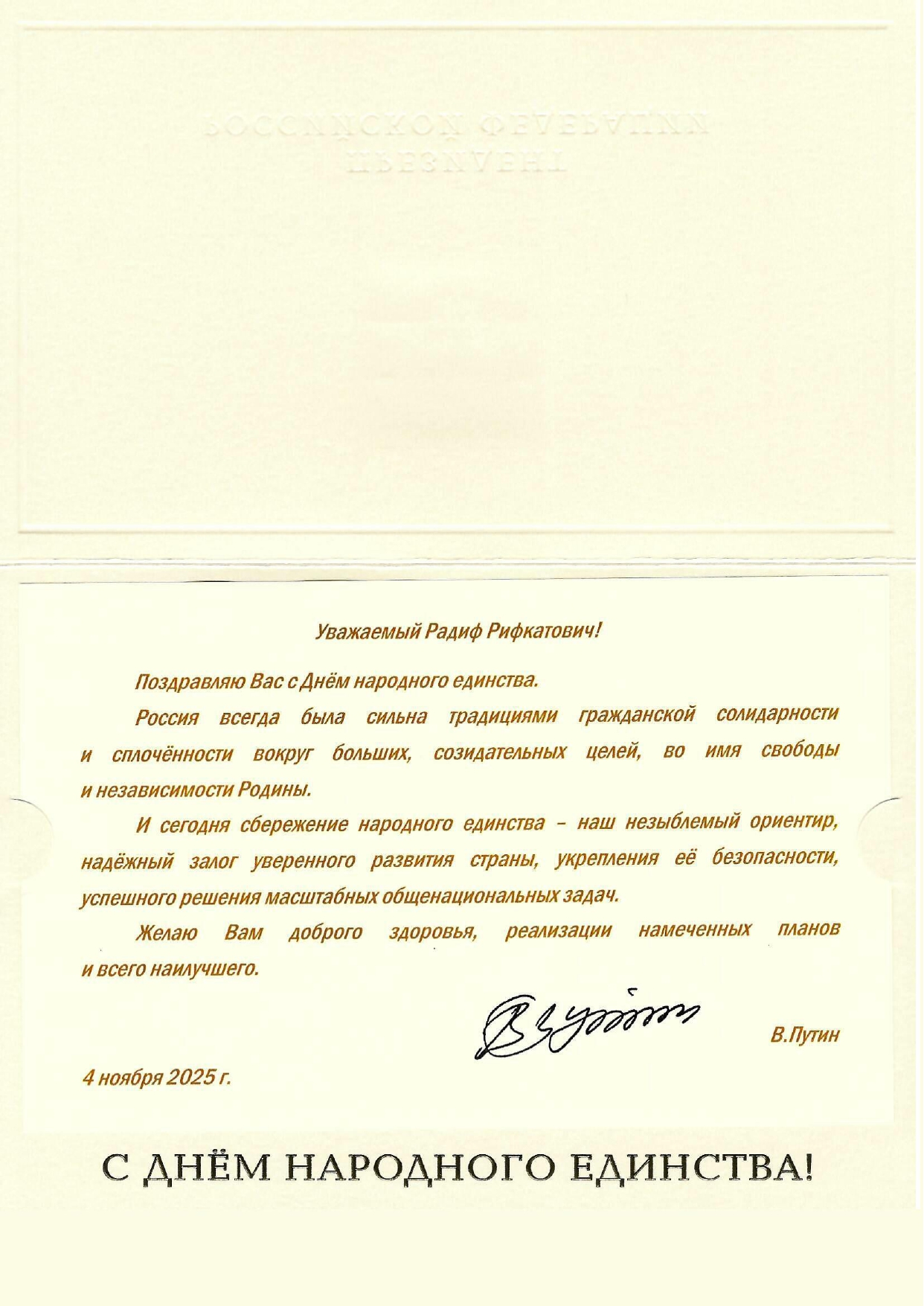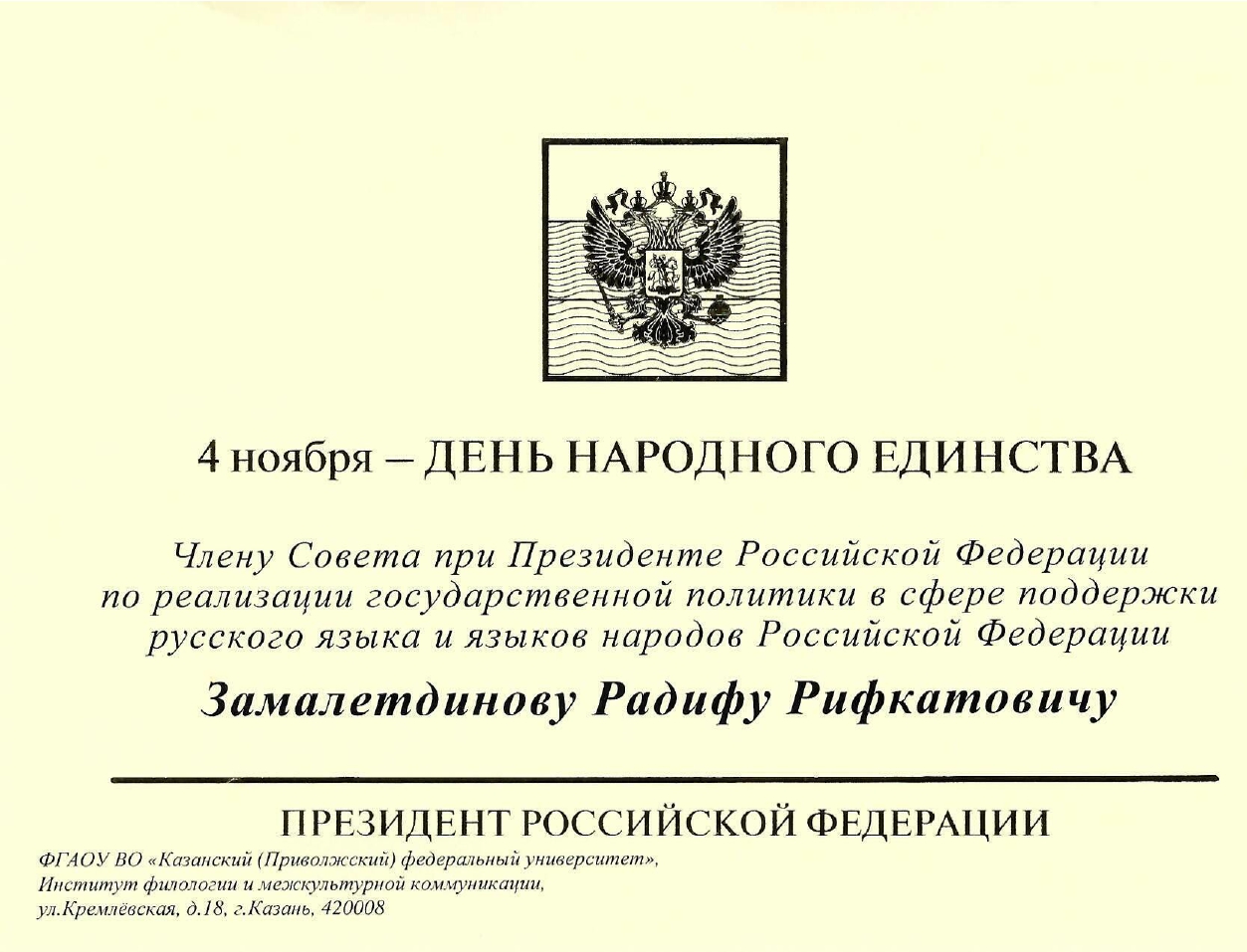 Директор Института филологии и межкультурной коммуникации Казанского федерального университета, профессор Радиф Замалетдинов получил персональное поздравление от Президента Российской Федерации Владимира Путина в связи с Днём народного единства.
