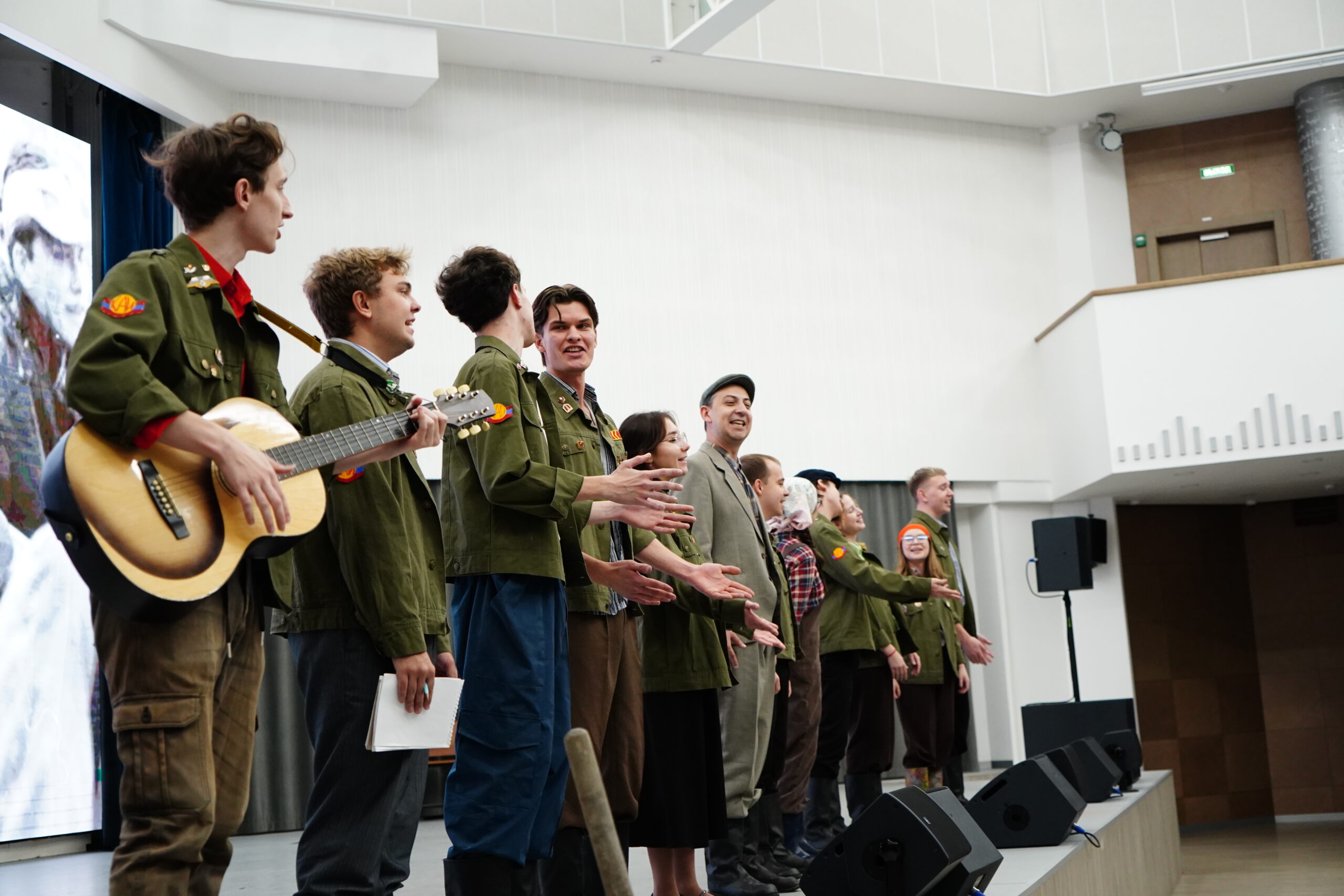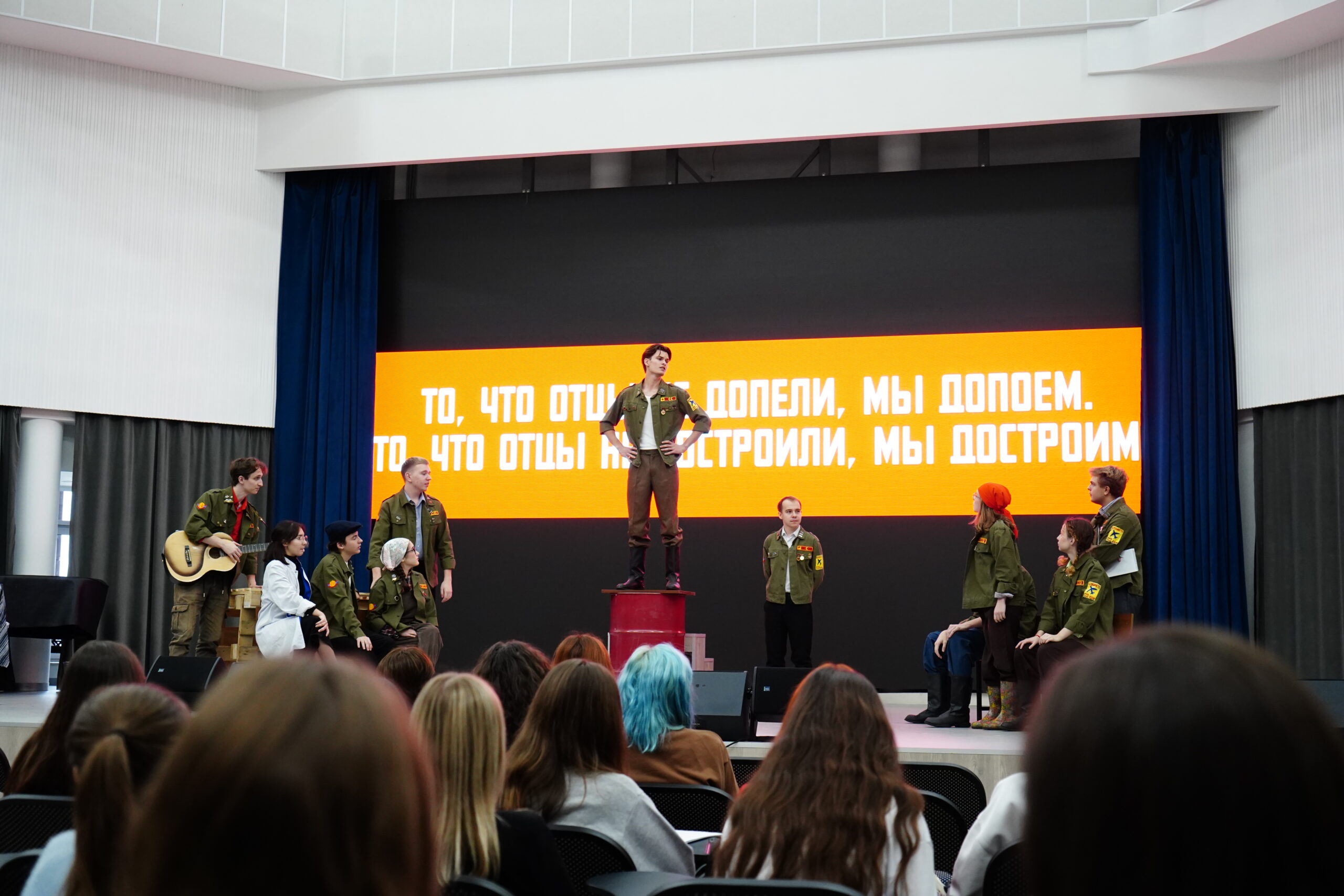 Театральный коллектив «Стройотрядовцы» в актовом зале института представили спектакль «Все мы…» по мотивам пьесы Михаила Шатрова «Лошадь Пржевальского» в рамках обучения по гранту Российских студенческих отрядов.