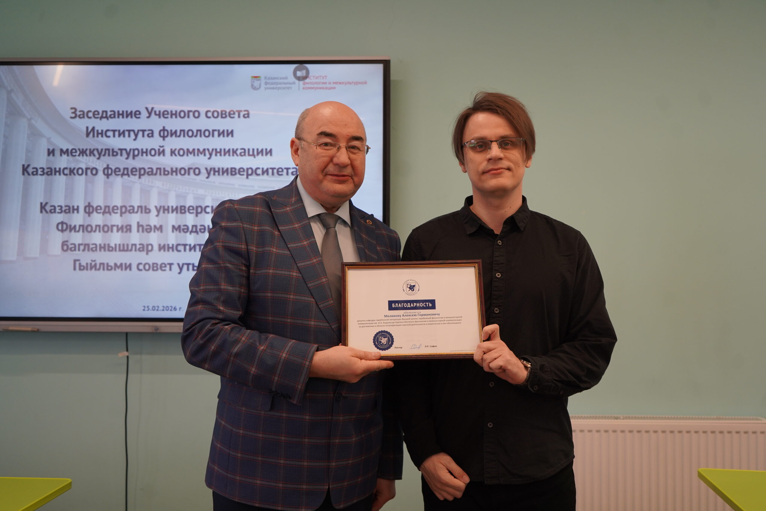 Благодарственное письмо за достижения в области популяризации научной деятельности и вовлечения в нее обучающихся было вручено доценту кафедры зарубежной литературы Высшей школы зарубежной филологии и межкультурной коммуникации им. И.А. Бодуэна де Куртенэ ИФМК КФУ Алексею Мелихову.