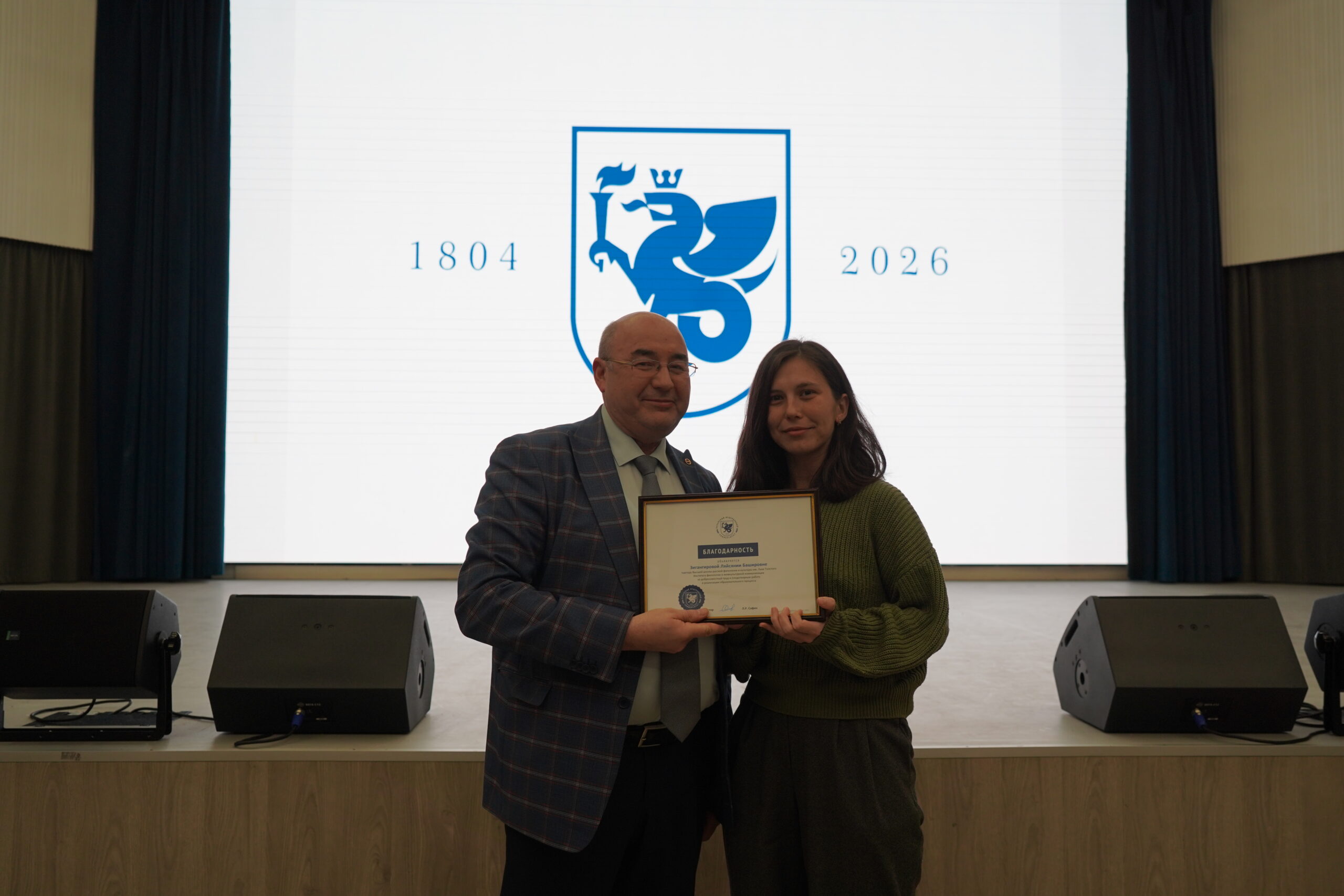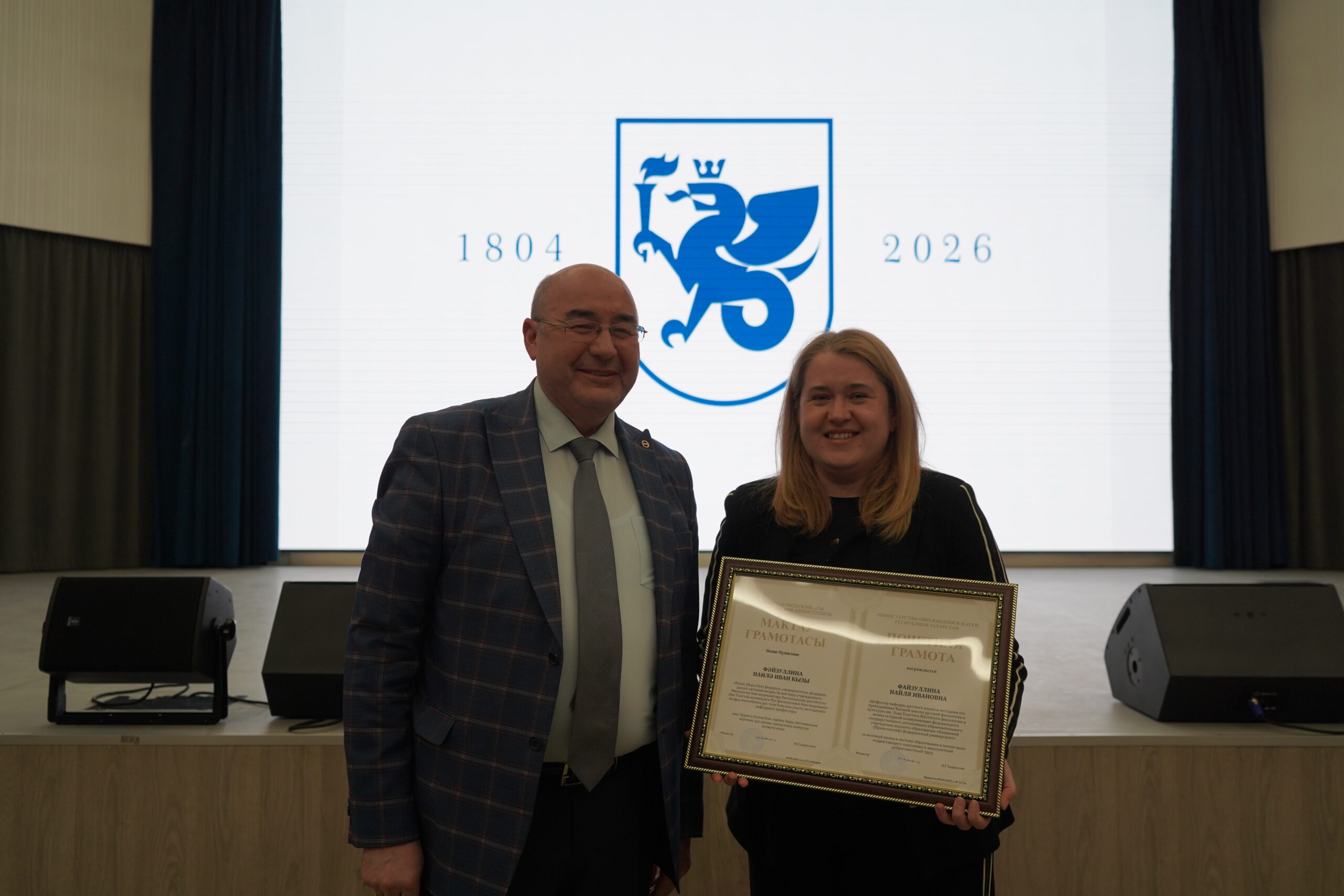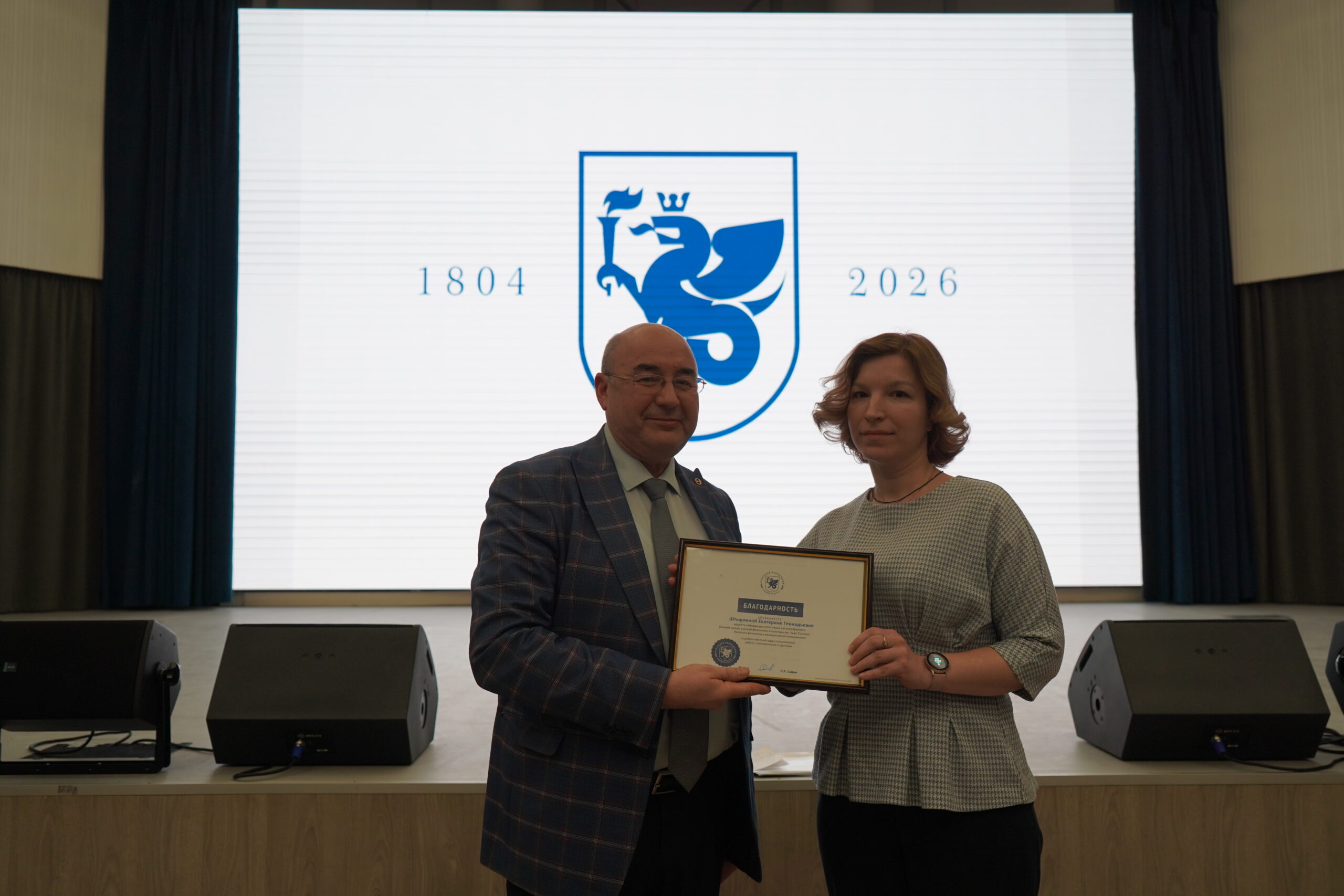 Благодарственным письмом ректора КФУ Ленара Сафина за добросовестный труд и плодотворную работу с иностранными студентами был отмечен доцент кафедры русского языка как иностранного Екатерина Штырлина, за добросовестный труд и плодотворную работу в реализации образовательного процесса – тьютор Высшей школы русской филологии и культуры им. Льва Толстого Ляйсяния Зигангирова