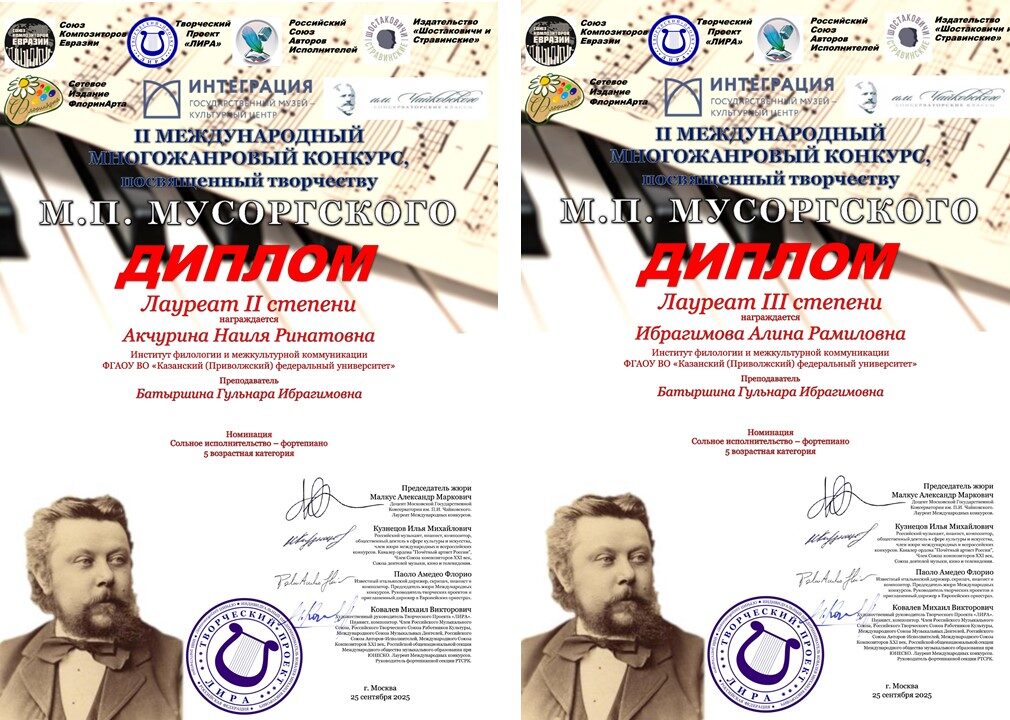 Успешное выступление в номинации «Сольное исполнительство» (фортепиано) принесло Н. Акчуриной и А. Ибрагимовой звания лауреатов
